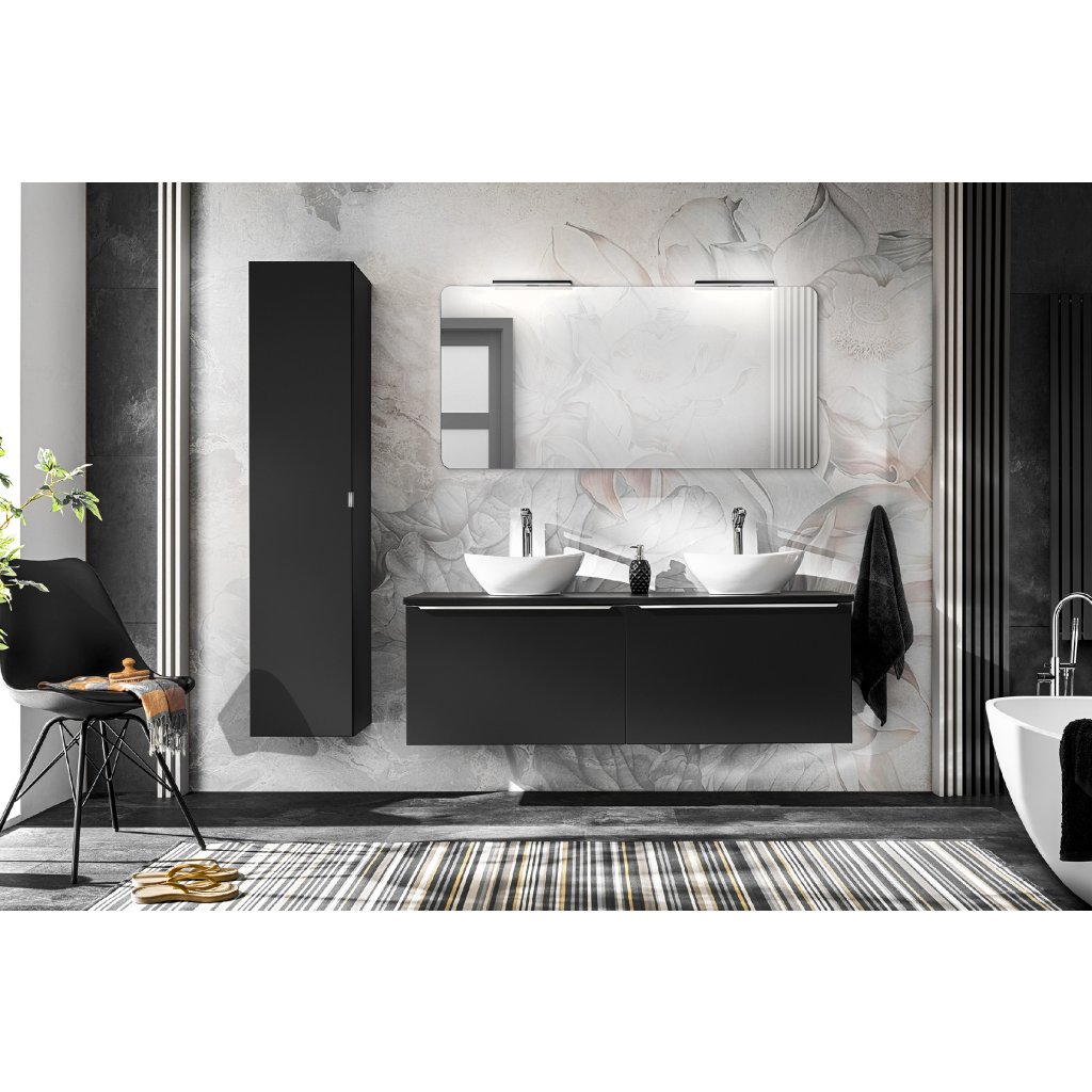 Skříňka pod umyvadlo z kolekce Santa Fe Black o šířce 80 cm představuje ideální řešení pro ty, kteří hledají eleganci a pořádek v koupelně. Celkové barevné provedení v hlubokém černém matu dodává nábytku luxusní, industriální nádech, který je jemně kontrastován chromovými úchytkami. Minimalistická hladká struktura čelních ploch podtrhuje moderní charakter celé řady Santa Fe Black.