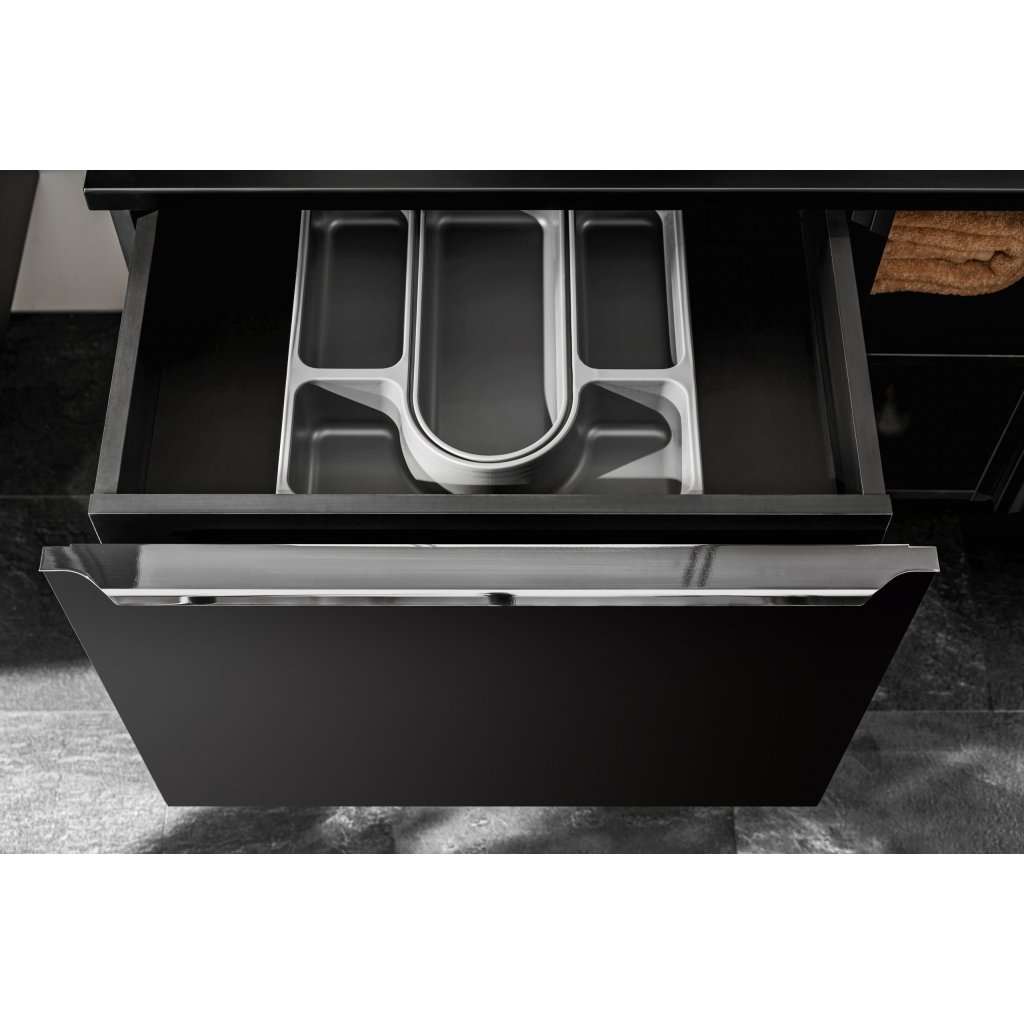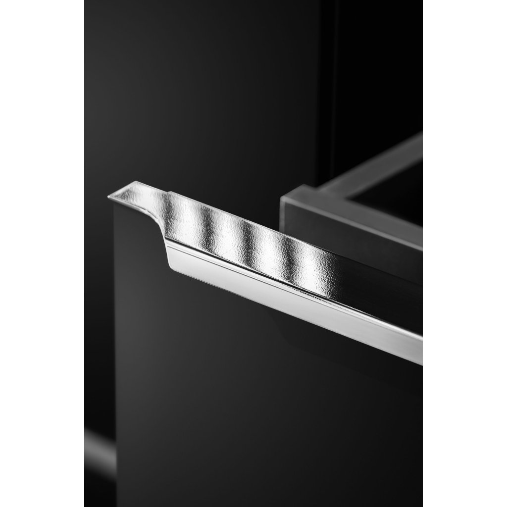 Úložný prostor je rozdělen do dvou zásuvek, které poskytují dostatek místa pro přehledné uspořádání kosmetiky a koupelnových potřeb. Vysoký komfort používání zajišťuje systém tichého dovírání, který zaručuje plynulý dojezd zásuvek a eliminuje hluk při zavírání. Skříňka je vybavena designovými hliníkovými krakvovými úchytkami, které jsou nejen estetické, ale i praktické pro každodenní manipulaci. Kombinace kvalitní laminované desky (LTD) na korpusu a MDF desky na frontách zajišťuje vysokou stabilitu a odolnost nábytku v náročném koupelnovém prostředí.