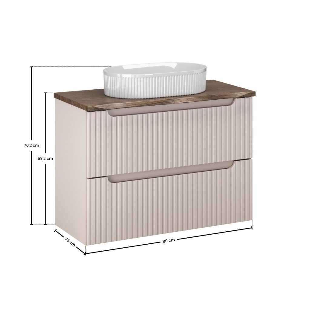 Koupelnová sestava z kolekce Nova Cashmere (80 cm) kombinuje eleganci jemného Kašmírového odstínu s rustikálním akcentem dubového dřeva. Závěsná skříňka o šířce 80 cm v barvě Kašmírový mat (LTD/MDF) má dvě prostorné zásuvky. Čela zásuvek jsou zdobena moderním vertikálním vroubkováním a minimalistickým integrovaným úchytem.