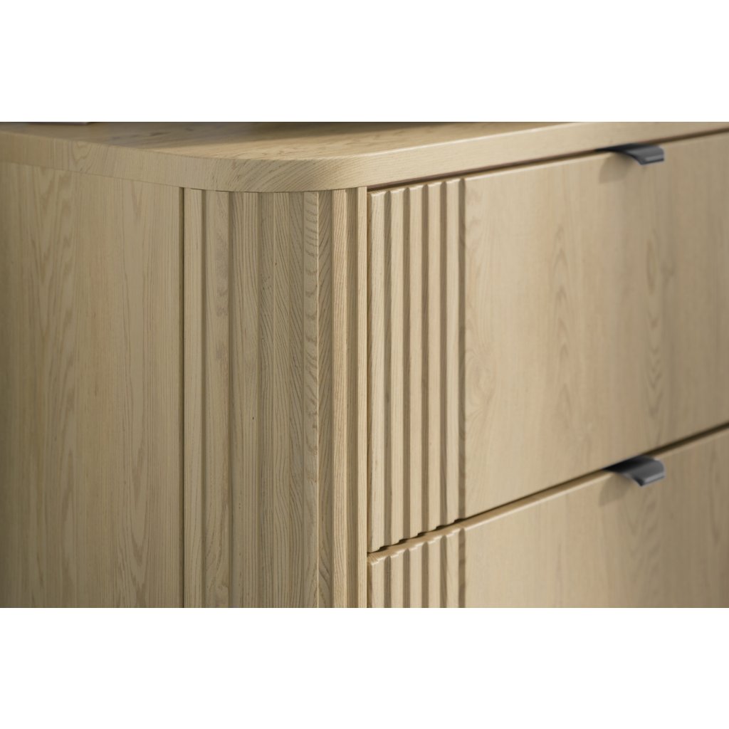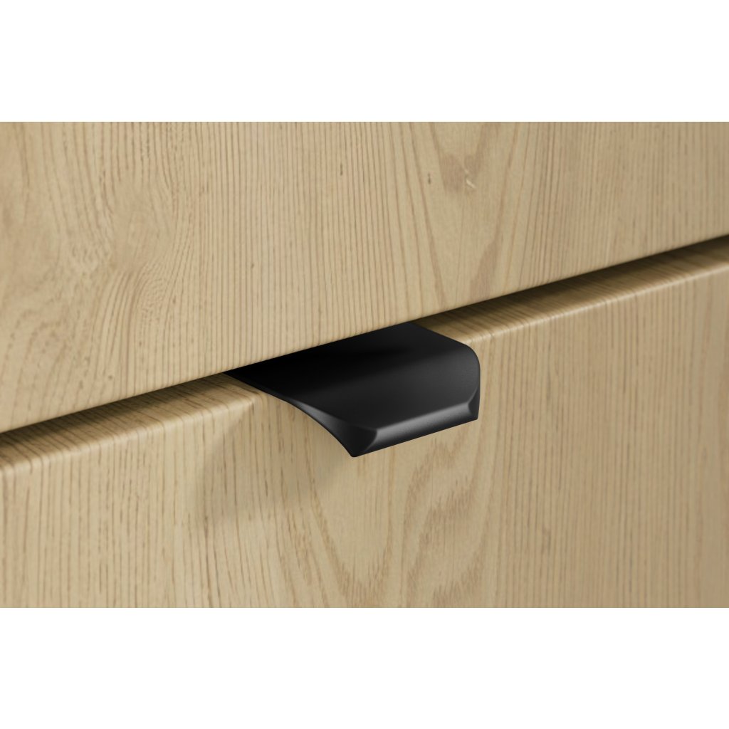 Čela zásuvek a zaoblené boky jsou zdobeny výrazným vertikálním vroubkováním. Dvě zásuvky s tichým dovíráním (Soft Close) poskytují dostatek úložného prostoru a černé kovové úchyty tvoří elegantní kontrast. S hloubkou 46 cm je sestava komfortnější pro každodenní použití. Deska Ocean ve stejném dekoru Dub Cremona (MDF) je rovněž opatřena zaoblenými rohy a tvoří perfektní podklad pro atypické nepravidelné keramické umyvadlo Cloud v bílém lesku. Umyvadlo je bez přepadu a bez otvoru pro baterii. Nábytek je vyroben z LTD a MDF desek.