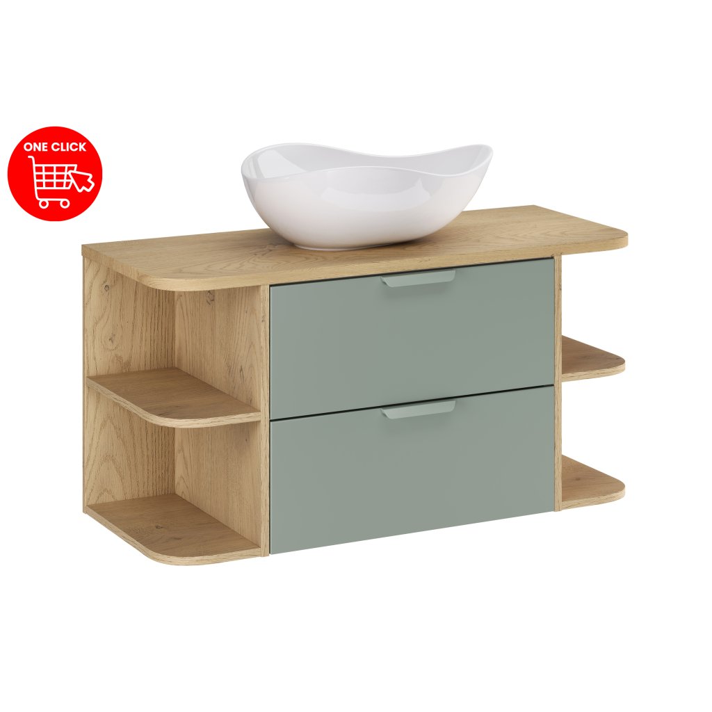 - set obsahuje: 1x umyvadlovou skříňku Aster Green (60 cm), 2x zaoblený boční regál (20 cm), 1x horní desku Ovalia (100 cm) a 1x asymetrické umyvadlo CLOUD FREE