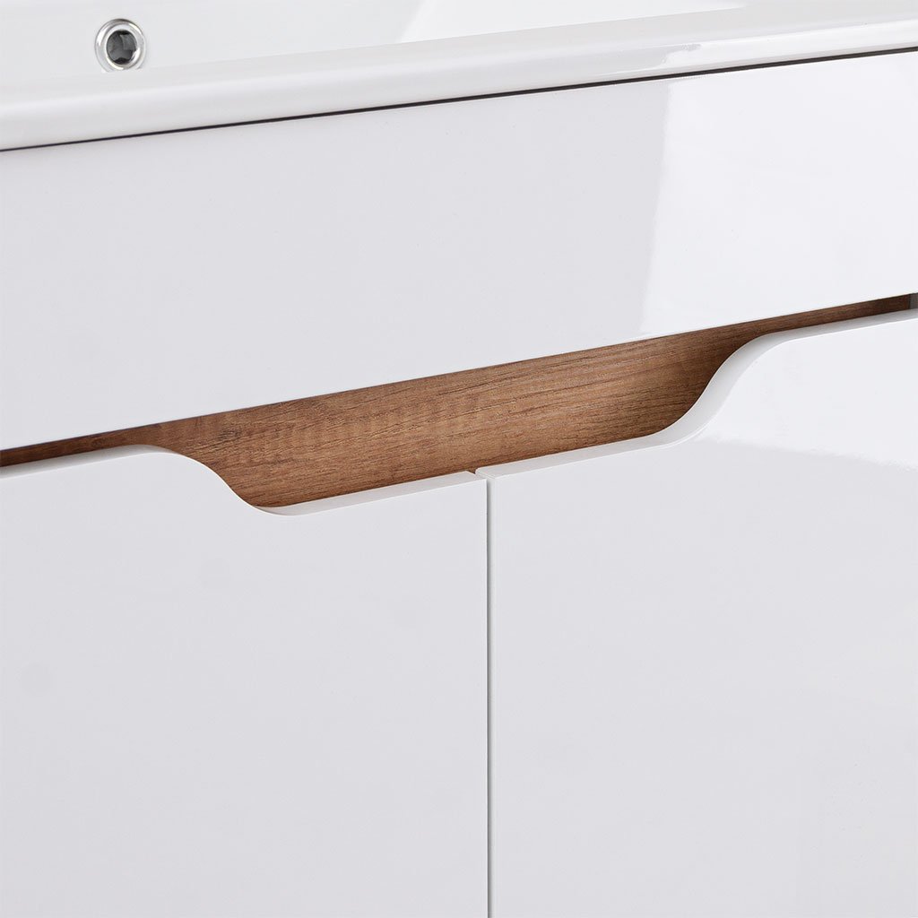 Korpus skříněk z bílé LTD desky je doplněn lesklými lakovanými dvířky bílé barvy s frézovanými madly v kombinaci s ozdobnou lištou v dekoru dub country. Dvířka jsou zavěšena na pantech se systémem tichého dovírání SoftClose.