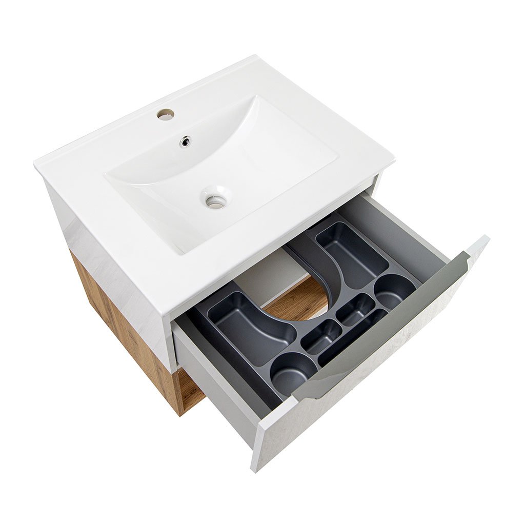 Skříňka s keramickým umyvadlem Neveda W 60 je určena k zavěšení na zeď pomocí rektifikačních závěsů. Součástí skříňky je keramické umyvadlo UM-ASU 60 s přepadem a otvorem pro montáž vodovodní baterie. Praktickým doplňkem je plastový organizér umístěný v horní zásuvce. Skříňka s umyvadlem i spodní otevřená police se zavěšují na zeď samostatně pomocí rektifikačních závěsů.