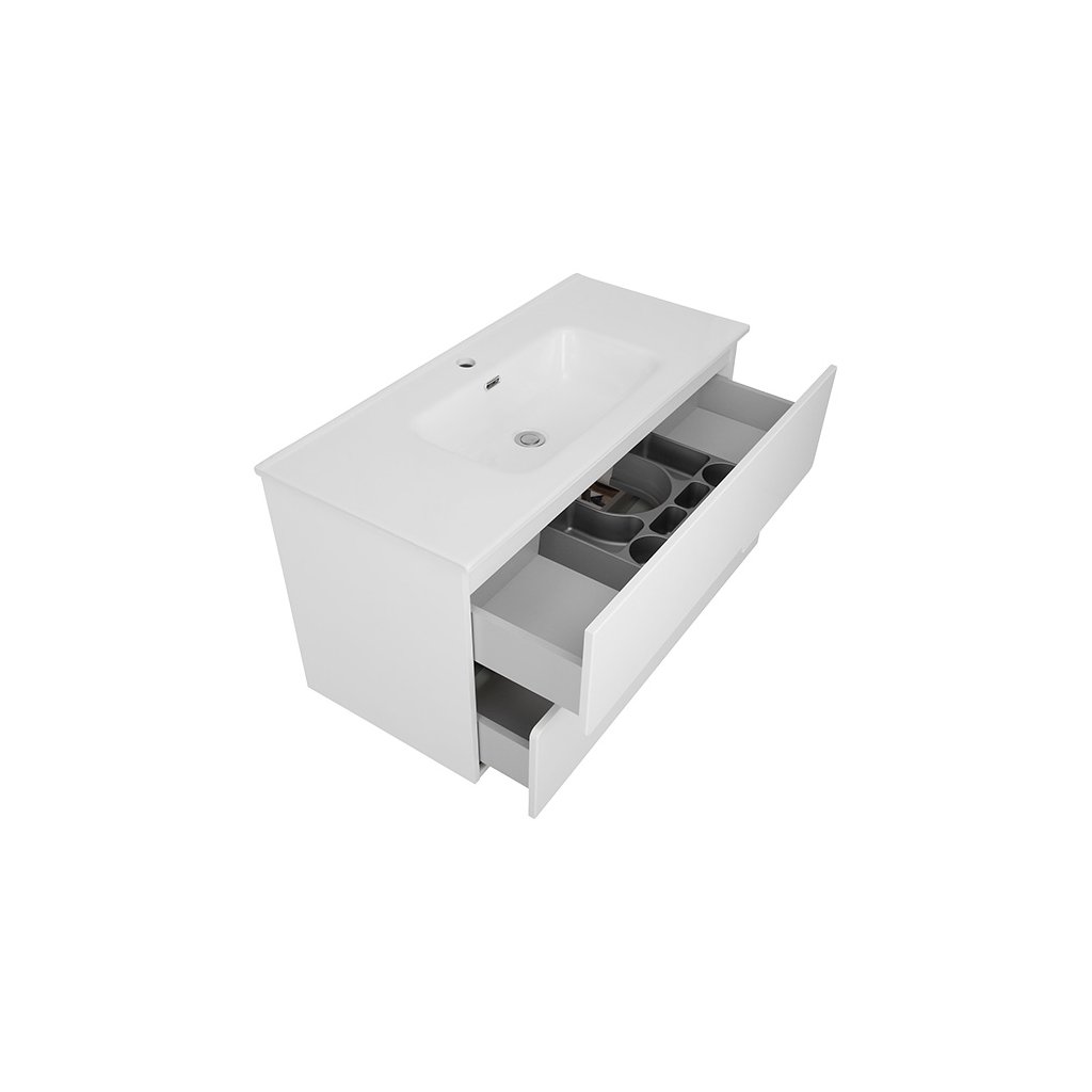 Skříňka s keramickým umyvadlem Spectrum W 100 je určena k zavěšení na zeď pomocí rektifikačních závěsů. Součástí skříňky je keramické umyvadlo UM-ASU 100 s přepadem a otvorem pro montáž vodovodní baterie (viz obrázek v galerii). Praktickým doplňkem je plastový organizér umístěný v horní zásuvce.