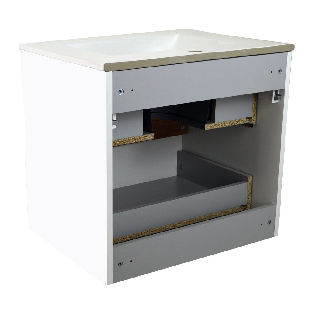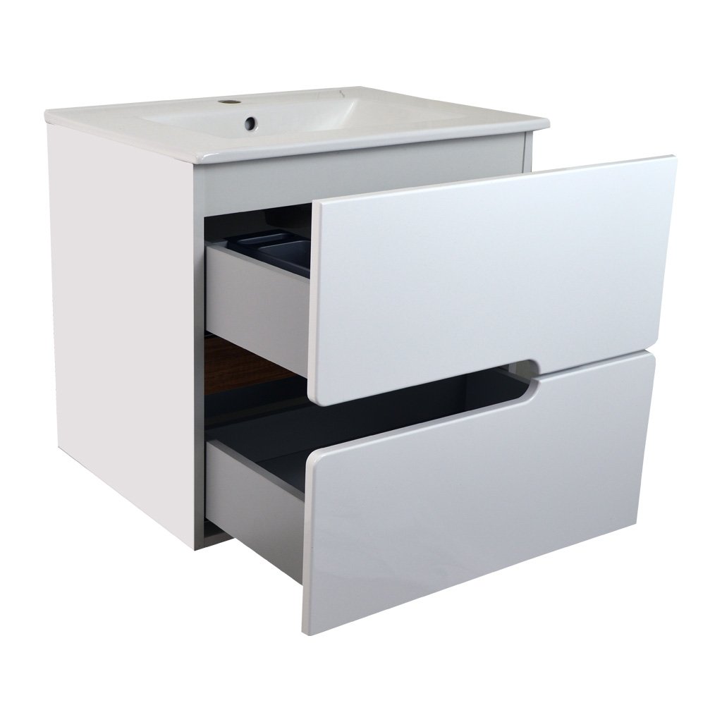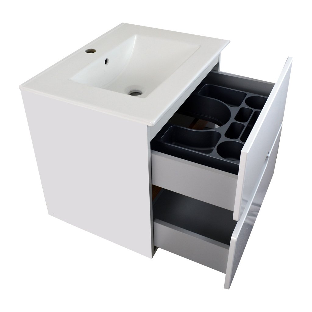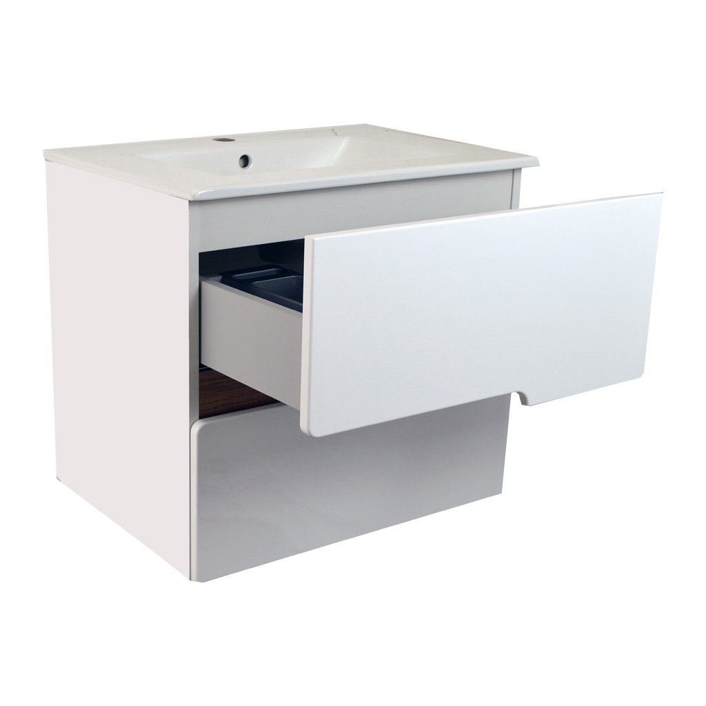 Skříňka s keramickým umyvadlem Spectrum W 60 je určena k zavěšení na zeď pomocí rektifikačních závěsů. Součástí skříňky je keramické umyvadlo UM-ASU 60 s přepadem a otvorem pro montáž vodovodní baterie (viz obrázek v galerii). Praktickým doplňkem je plastový organizér umístěný v horní zásuvce.