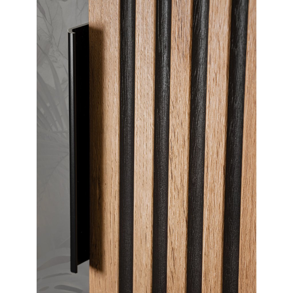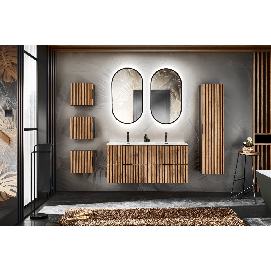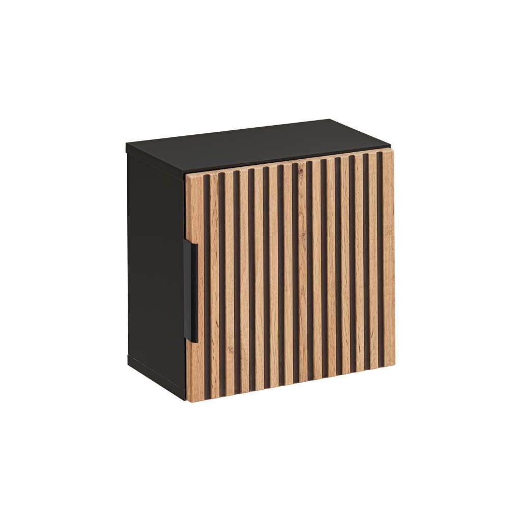 Dvířka skříňky zaujmou na první pohled svými frézovanými detaily, které nábytku propůjčují texturu a hloubku. Snadnou manipulaci zajišťuje decentní hranová úchytka v barvě černý mat. Skříňka je vybavena systémem tichého dovírání, který zvyšuje komfort používání a chrání nábytek před nárazy. Použití kvalitní MDF desky na čelních plochách a laminované desky (LTD) na korpusu zaručuje vysokou odolnost proti vlhkosti a snadnou údržbu v koupelnovém prostředí.