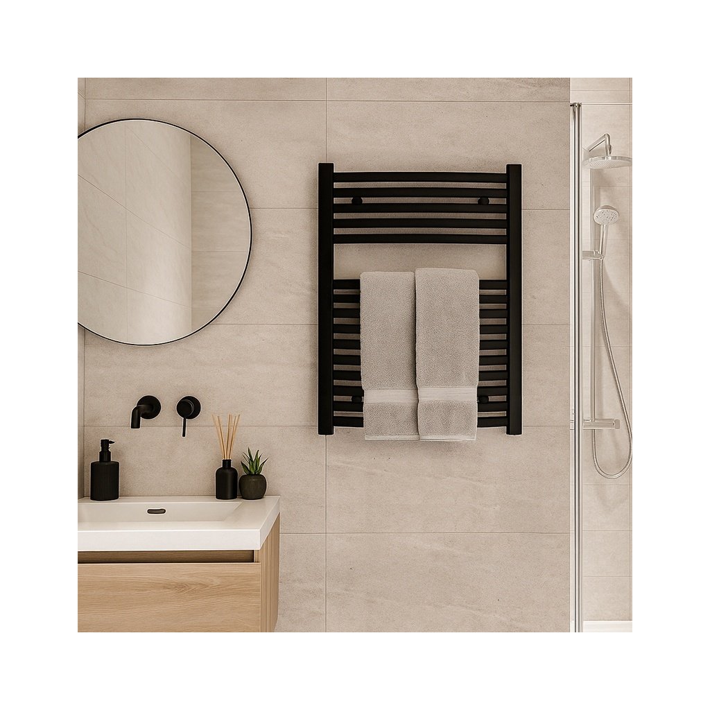 Koupelnový radiátor HYD-GAM-BL je ideální volbou pro všechny, kdo hledají kombinaci stylu, kvality a praktičnosti. Je vyroben z odolné oceli, která zaručuje dlouhou životnost a spolehlivý provoz i v náročných podmínkách koupelny. Díky svému modernímu provedení se dokonale hodí do různých typů interiérů a podtrhuje jejich charakter. Je určen k připojení na systém ústředního topení. Jde o hybridní model - voda a elektřina, který je určen k připojení na systém ústředního topení, umožňující zároveň instalaci volitelného el. topného tělesa s termostatem do výkonu 448 W, které zajistí přitápění nebo pohodlné sušení ručníků i mimo topnou sezónu.