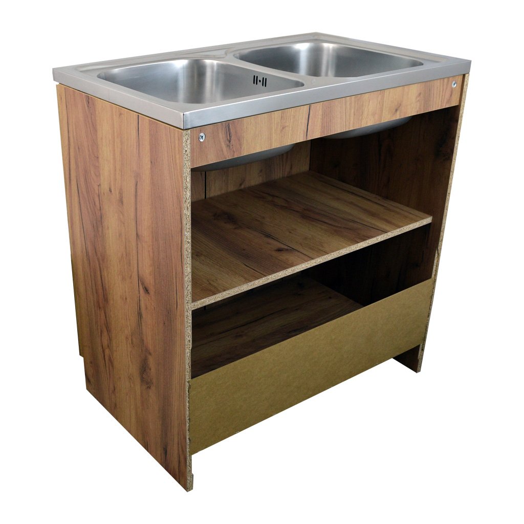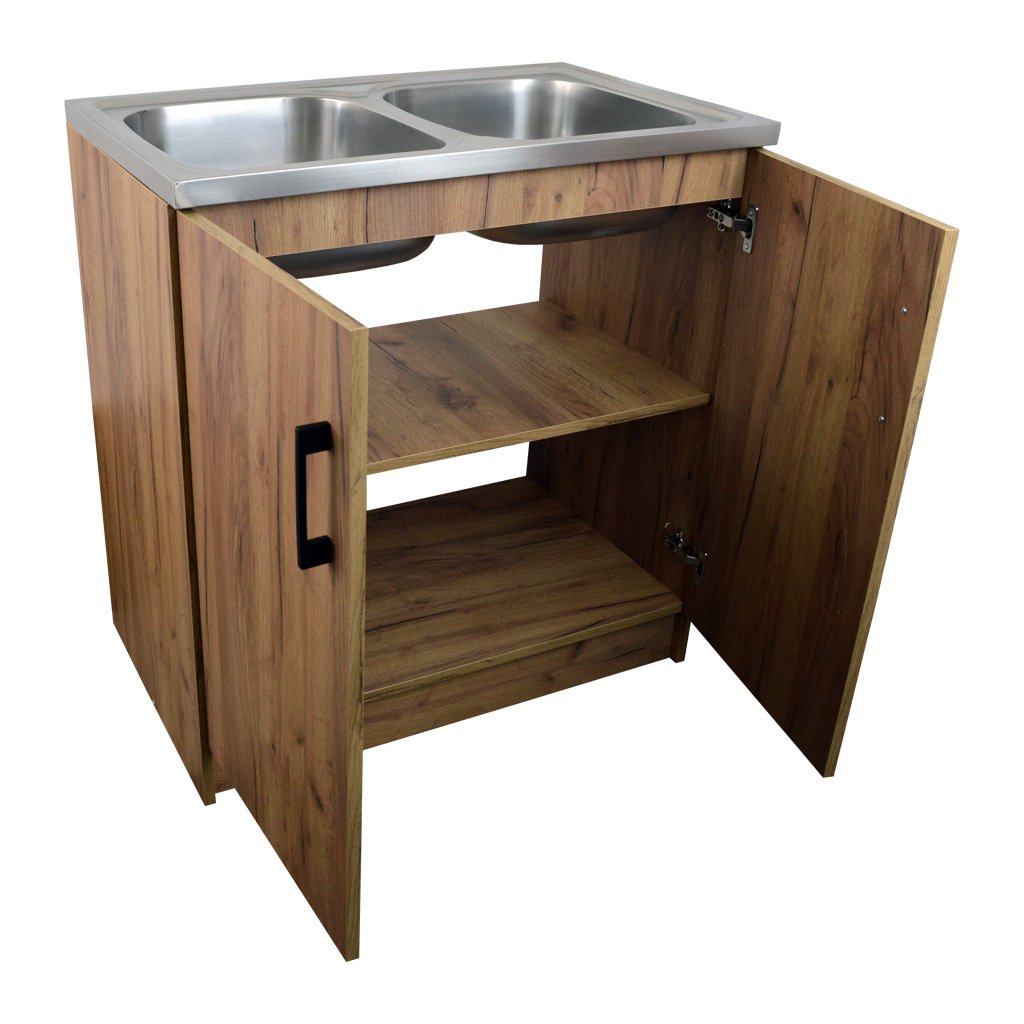 Dvoudveřová kuchyňská skříňka spodní 80 cm s nerezovým dvojdřezem. Korpus skříňky, dvířka a police jsou z LTD desky tloušťky 16 mm, dvířka jsou doplněna černými plastovými madly. Součástí skříňky je nerezový dřez se dvěma mycími komorami. Tuto skříňku lze doplnit 80 cm širokou závěsnou horní skříňkou ve stejném dekoru.