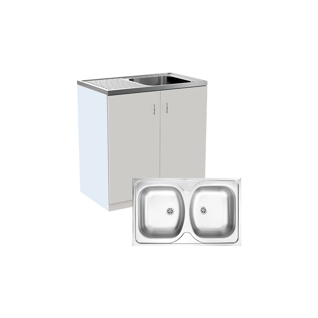 Dvoudveřová kuchyňská skříňka spodní 80 cm s nerezovým dvojdřezem. Korpus skříňky, dvířka a police jsou z LTD desky tloušťky 16 mm, dvířka jsou doplněna chromovanými madly. Součástí skříňky je nerezový dřez se dvěma mycími komorami. Tuto skříňku lze doplnit ostatními kuchyňskými skříňkami ze stejné produktové řady a sestavit tak kuchyňskou linku libovolných rozměrů.
