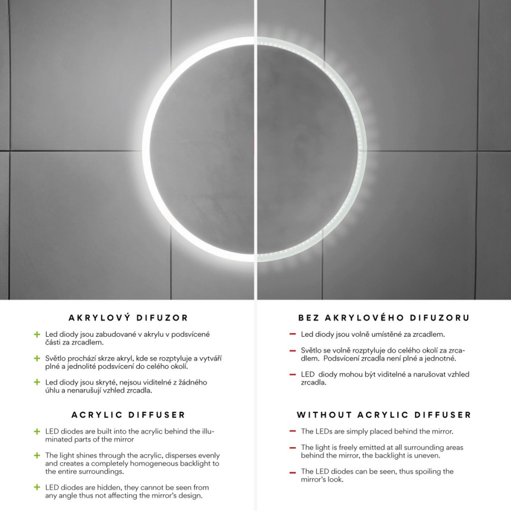 Pro dosažení kvalitního a rovnoměrného svícení je použit akrylový difuzor, který zajišťuje měkký a harmonický rozptyl světla bez viditelných bodových zdrojů. LED diody jsou vkusně integrovány do rámu spolu s difuzorem, což přispívá k elegantnímu a čistému vzhledu zrcadla.