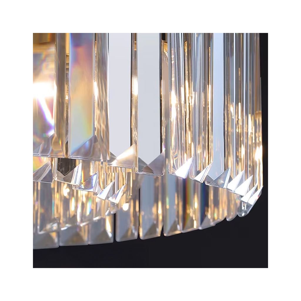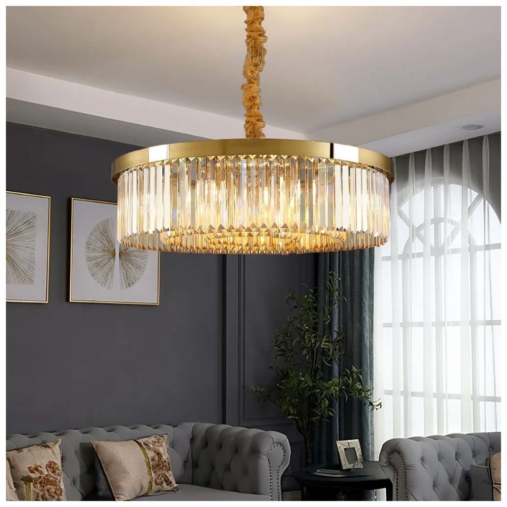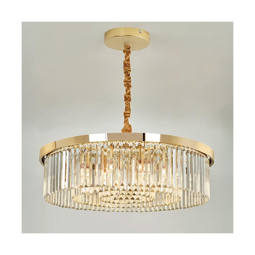 Křišťálová lampa ve zlatém provedení je elegantní dekorativní kousek, který zaujme svým tvarem a kvalitou zpracování. Její kruhový design s kovovým rámem ve zlaté barvě dokonale spolupracuje s křišťálovými detaily a vytváří působivé osvětlení plné jiskry.Světlo pronikající četnými křišťálovými prvky se rozptyluje do místnosti a dodává jí jedinečný a luxusní dojem.