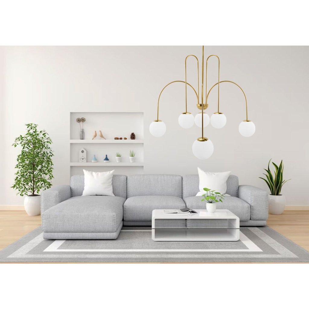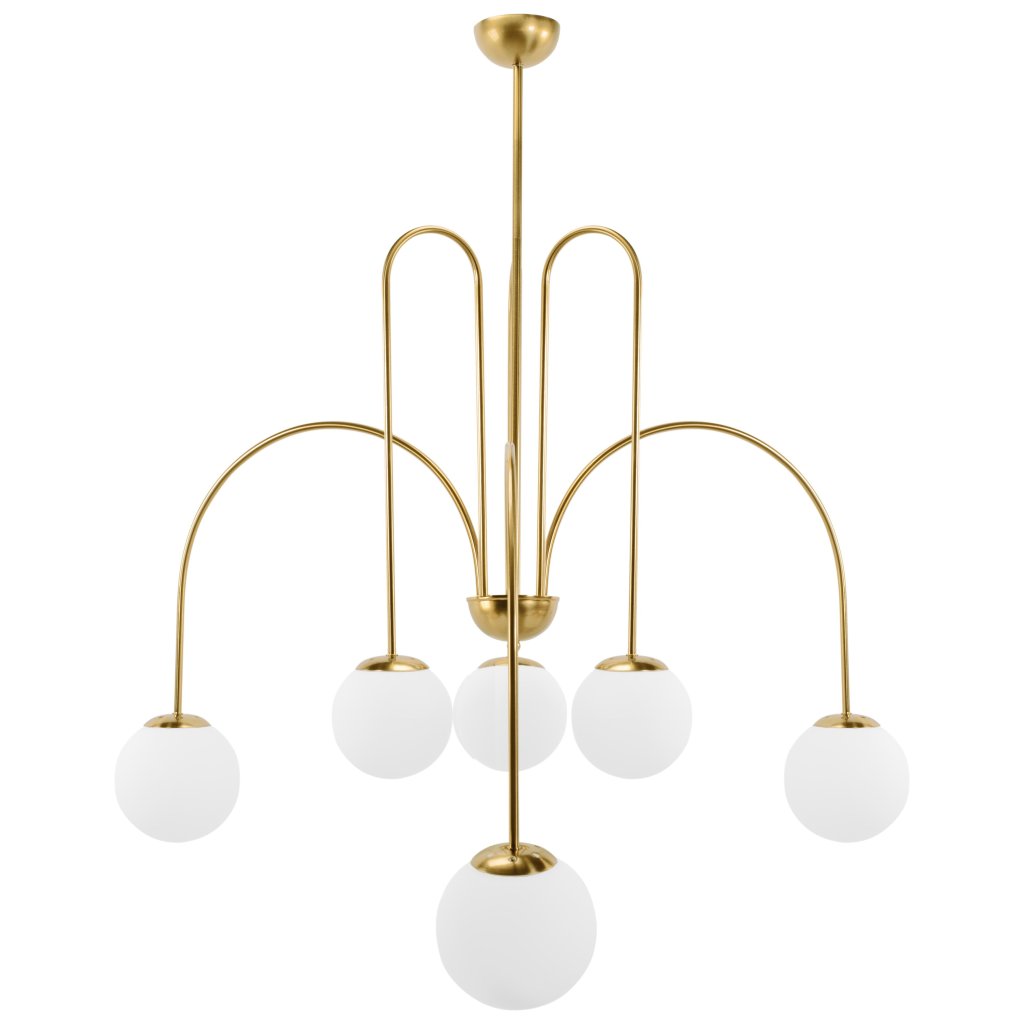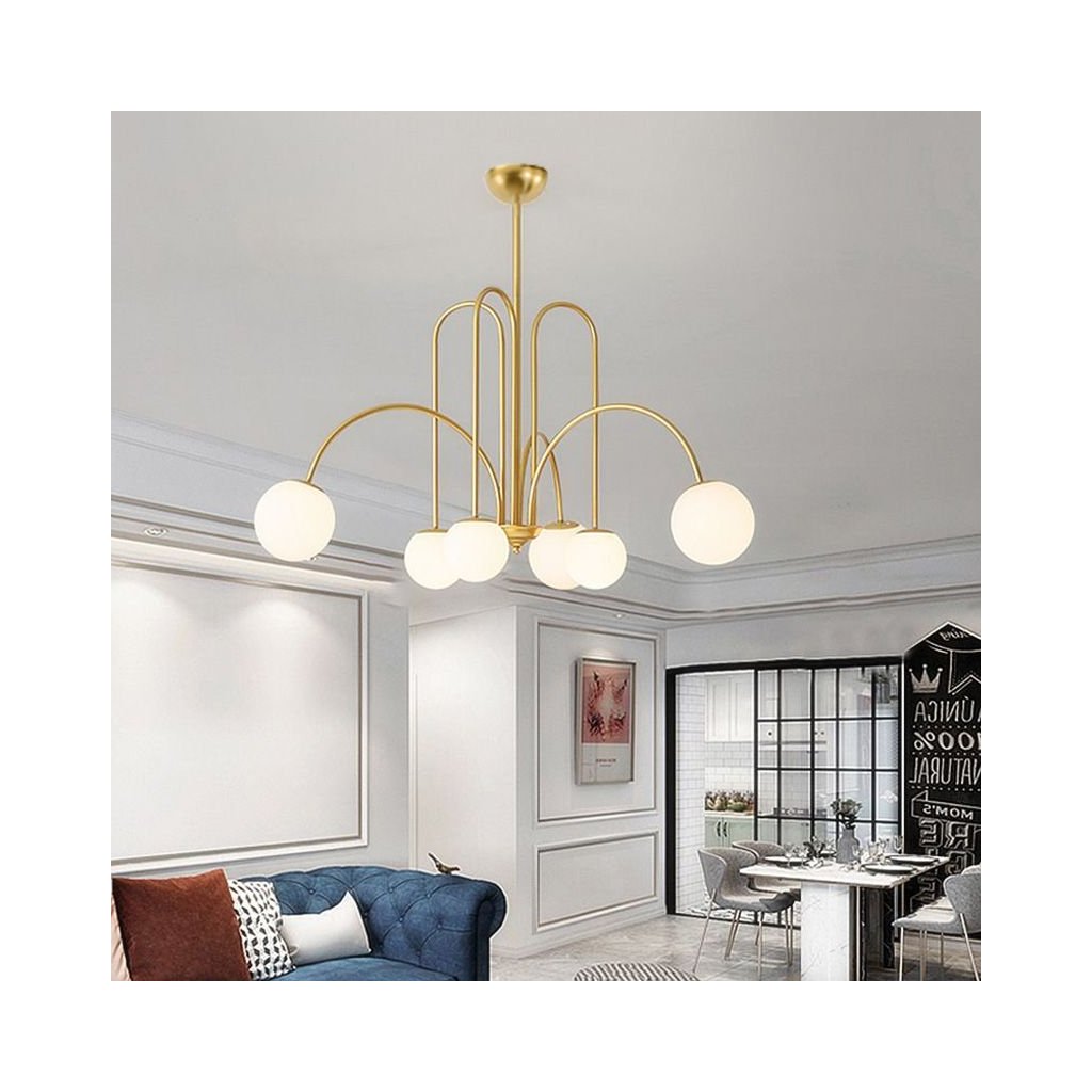Elegantní a moderní stropní svítidlo, které dodá jedinečný styl každému interiéru.Lampa má 6 skleněných stínidel s jemnou mléčnou barvou, která jsou umístěna na zlatém podstavci, takže se dokonale hodí do moderního, minimalistického prostředí.