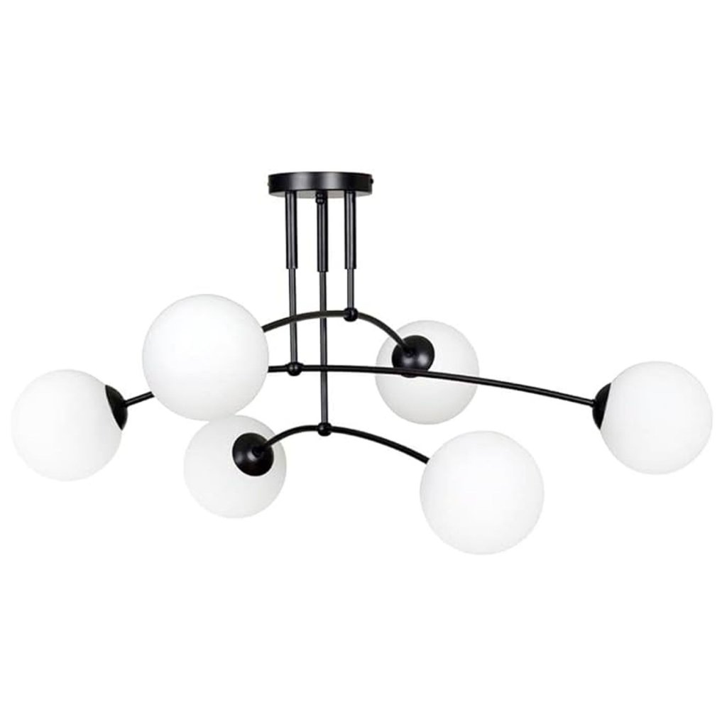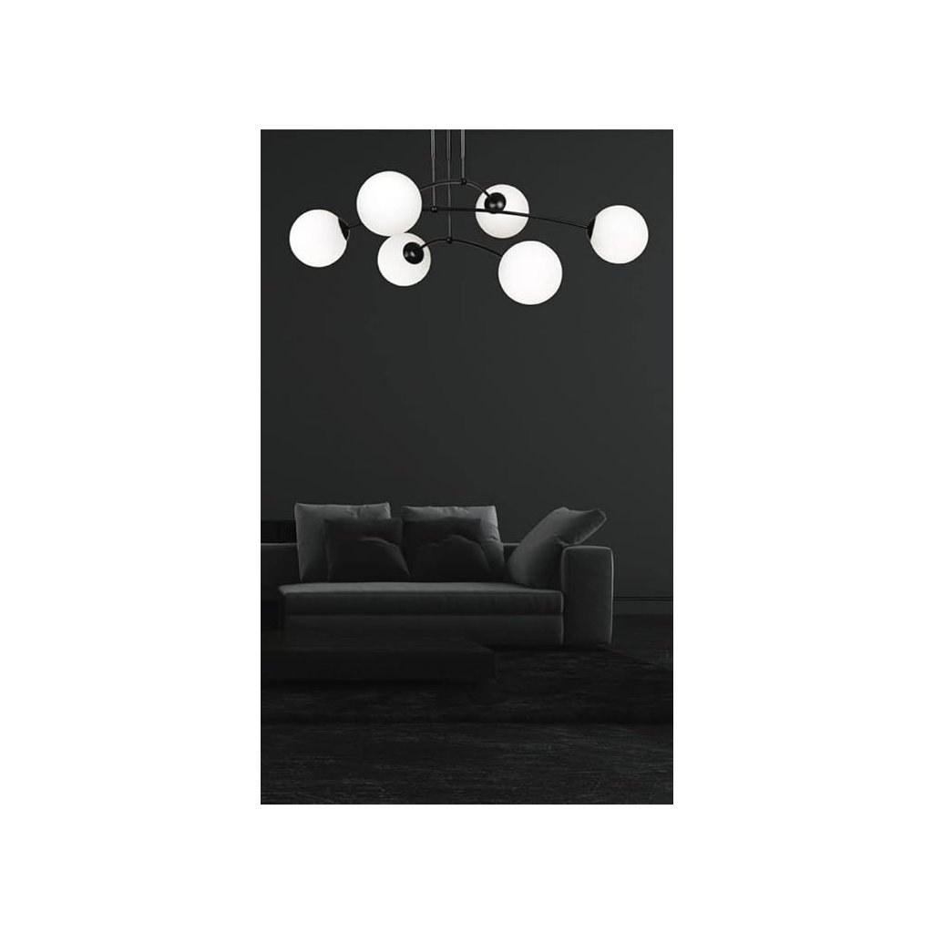 Moderní a stylové stropní svítidlo, které zaujme svým jedinečným tvarem a minimalistickým designem.Je vybaveno šesti kulovými stínidly z mléčného skla, která jemně rozptylují světlo a vytvářejí v místnosti příjemnou atmosféru.