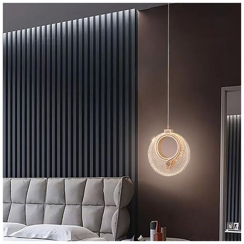 Moderní závěsné LED osvětlení spojuje precizní zpracování s výjimečným vizuálním efektem. Jeho originální, kulatý tvar je vyroben z kombinace hliníku v odstínu růžového zlata a průhledného akrylu s povrchem imitujícím křišťál.