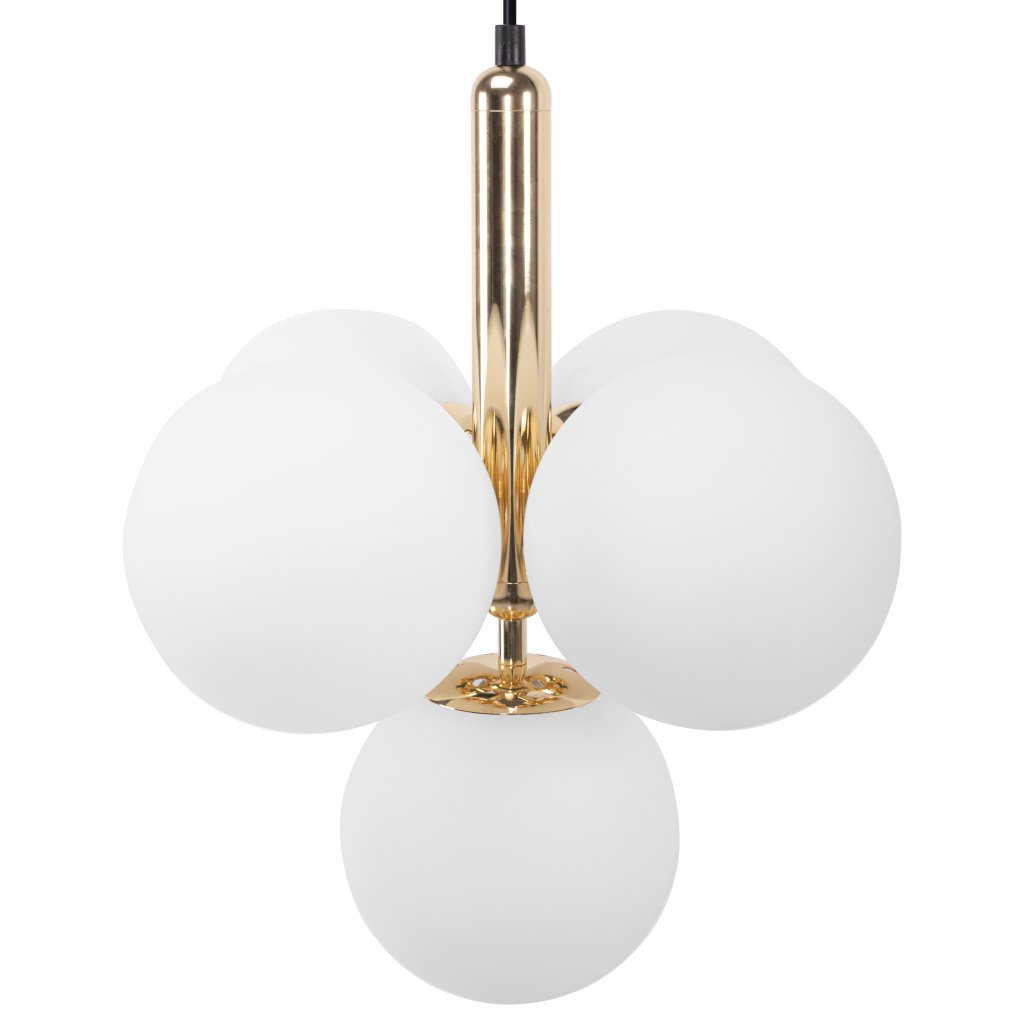Elegantní a moderní stropní svítidlo, které dodá jedinečný styl každému interiéru.Lampa má pět skleněných stínidel s jemnou mléčnou barvou, která jsou umístěna na zlatém podstavci, takže se dokonale hodí do moderního, minimalistického prostředí.