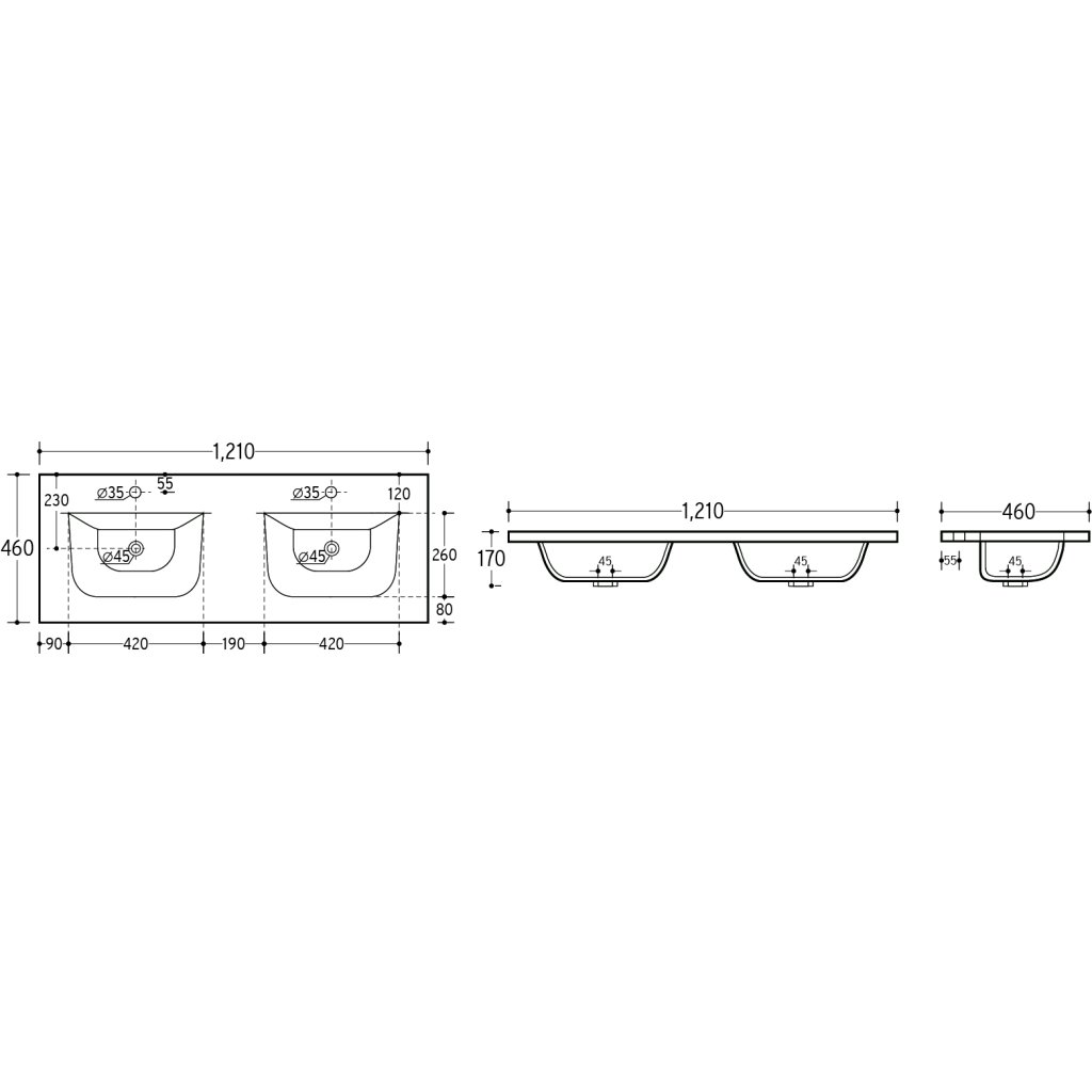 S rozměry 121 x 46 cm se toto dvojumyvadlo stává dominantou prostoru. Mezi mísami vzniká praktická odkládací plocha pro hygienické potřeby. Významným benefitem je glazovaná zadní strana, díky které působí umyvadlo dokonale ze všech pohledových úhlů. Je určeno k zapuštění do umyvadlové skříňky, má dva otvory pro baterii a dva bezpečnostní přepady.