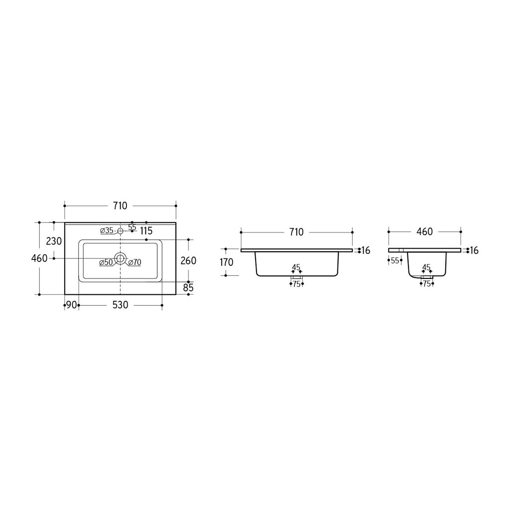 S celkovými rozměry 71 x 46 cm nabízí toto umyvadlo velkorysou mycí plochu. Mísa o šířce 53 cm a hloubce 17 cm zajišťuje pohodlné mytí bez cákání vody kolem. Významným benefitem je glazovaná zadní strana, díky níž působí umyvadlo esteticky i v otevřeném prostoru. Je určeno k zapuštění do umyvadlové skříňky, má připravený otvor pro baterii a bezpečnostní přepad.