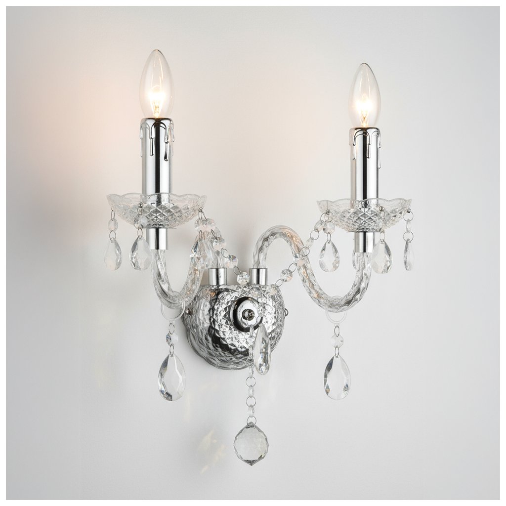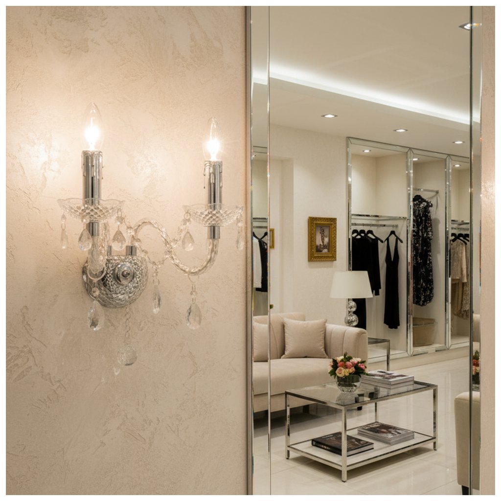Stylový dvouramenný nástěnný osvětlení kombinuje klasický design s moderní funkčností. Dekorativní detaily a jemné závěsy mu dodávají výjimečný charakter, díky čemuž se skvěle hodí jako akcentní osvětlení do obývacího pokoje, ložnice, předsíně či jídelny. Ramena lampy lze nastavit pod požadovaným úhlem, což umožňuje přizpůsobit směr světla individuálním potřebám. Celá konstrukce je vyrobena z lehkého plastu. Osvětlení je určeno pro dvě žárovky E14, které lze vybrat podle vlastních preferencí, a to jak z hlediska barvy světla, tak jeho intenzity. Dekorativní charakter lampy dokonale ladí s aranžmá ve stylu glamour, klasickém, moderním i vintage.