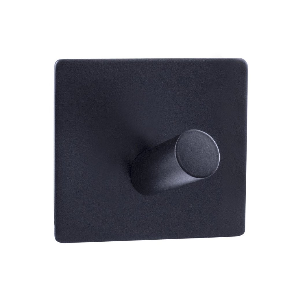 Kovový držák na ručníky v černé barvě. Připevněno na lepicí pásce.