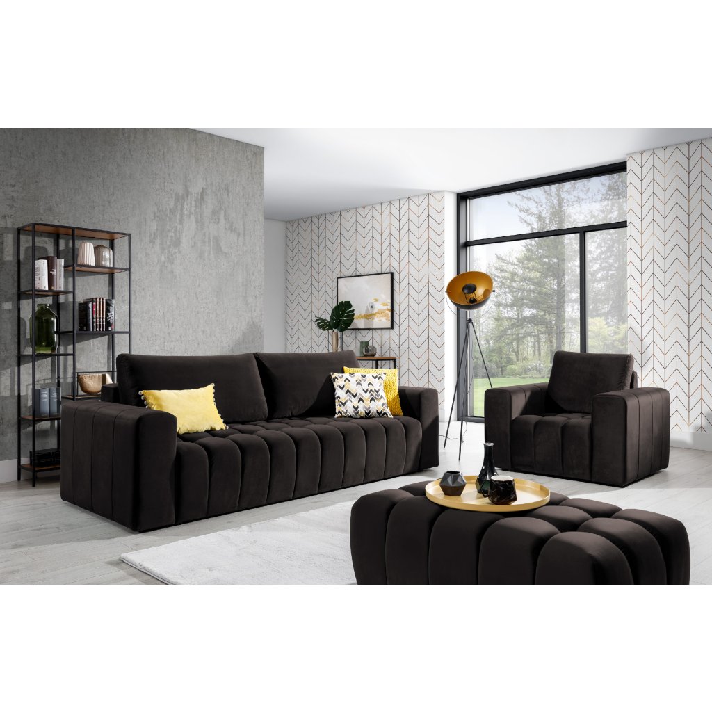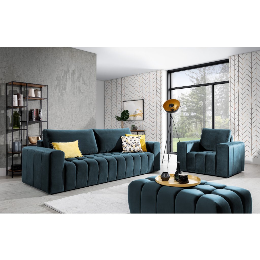 Křeslo a taburet dokonale doplňují sedačku v prostoru. Taburet je multifunkční, velmi snadno jej proměníte v další sedací plochu, pohodlnou podnožku a nebo v odkládací stolek.