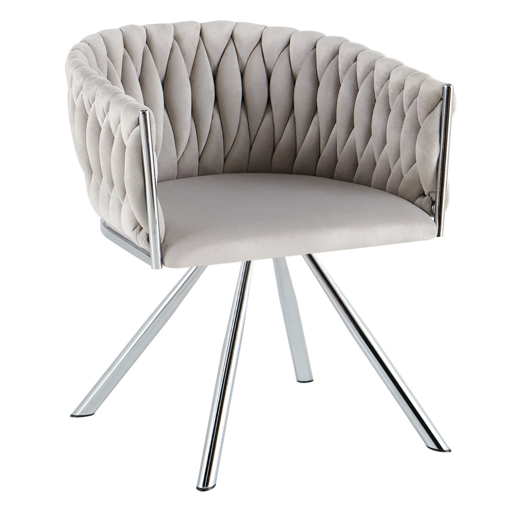 Otočné jídelní křeslo HELIN představuje dokonalou kombinaci elegance a moderního designu, která okamžitě pozvedne úroveň vašeho interiéru. Výrazným prvkem je netradiční proplétání zádové opěrky, které v kombinaci s jemnou látkou Velvet vytváří luxusní vzhled a dodává křeslu unikátní charakter. Světle šedé provedení působí velmi vkusně a snadno se kombinuje s ostatním vybavením domácnosti.