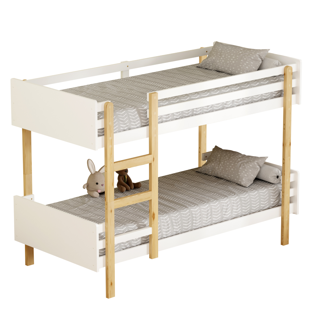 Moderní patrová postel DAMLA představuje ideální řešení pro dětský pokoj, kde je kladen důraz na úsporu místa a maximální funkčnost. Kombinace přírodního borového dřeva a elegantní bílé barvy v dekoru dubu přináší do interiéru svěží a nadčasový vzhled, který se snadno přizpůsobí jakémukoliv stylu zařízení. Díky pevné konstrukci na nožičkách a bezpečnostní bariéře poskytuje dětem pocit bezpečí a pohodlí během spánku i odpočinku.