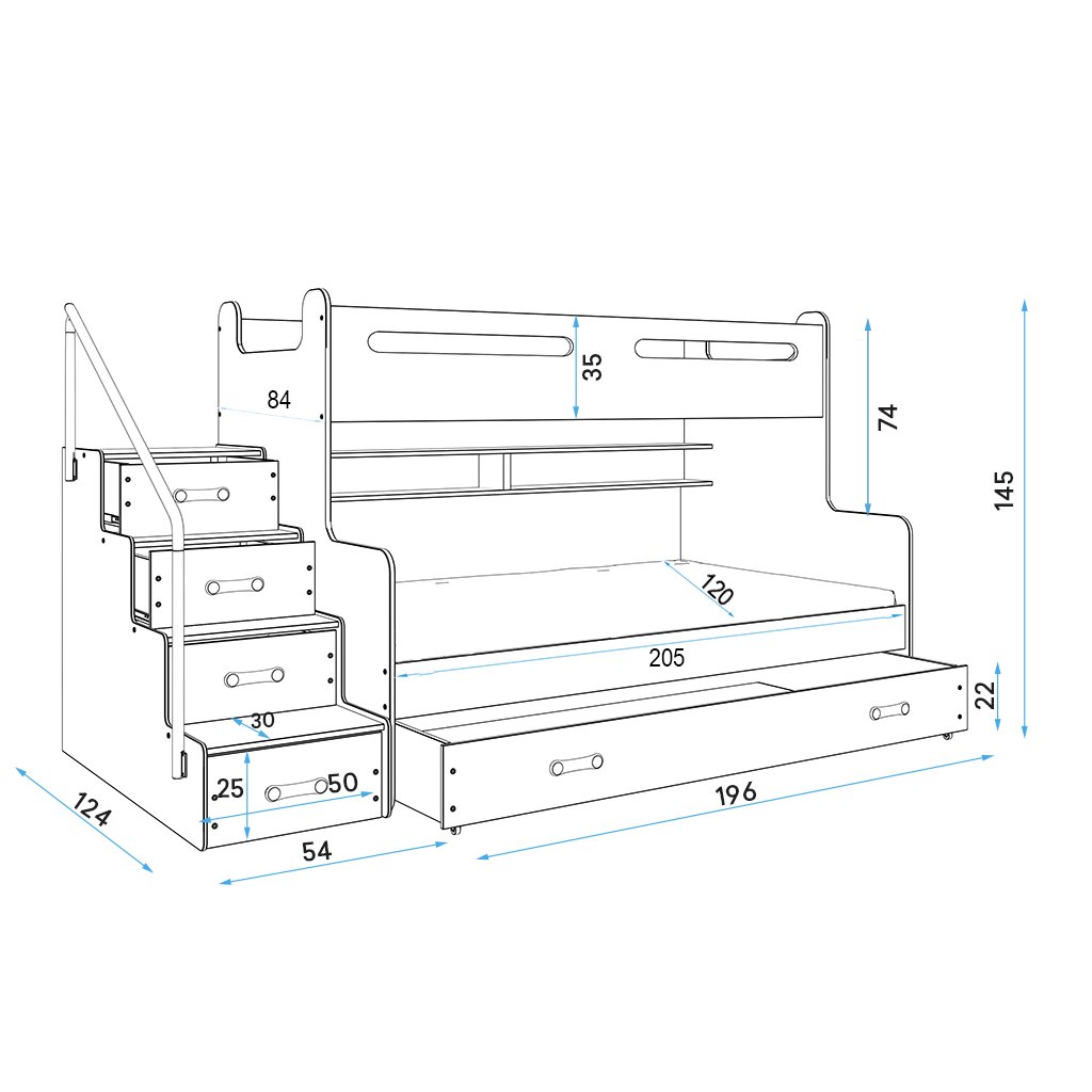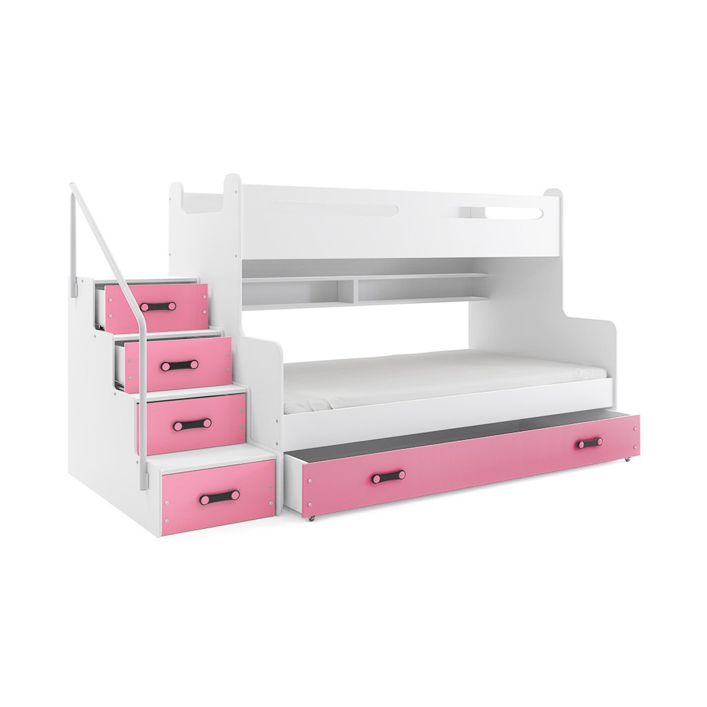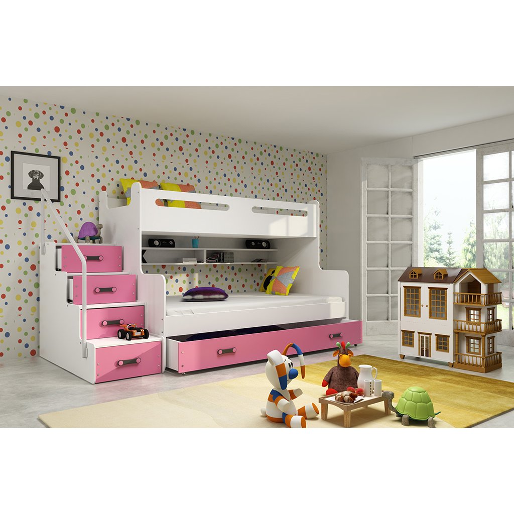 Dětská patrová postel Maty je určena pro ty, kteří pro své děti hledají funkčnost, moderní design a kvalitu. Její stabilní konstrukce, zaoblené hrany a zábrana na horní posteli, zajišťují bezpečnost a pohodlí dítěte. Postel nabízí prostor pro spaní až pro 3 děti a také spoustu úložných prostorů, které jsou v dětském pokoji nepostradatelné. Úložný prostor se skrývá ve spodní výsuvné části a také ve schůdkách, které vedou na vrchní část postele. Díky tomuto netradičnímu řešení, jsou schůdky dostatečně velké a bezpečné. Pro větší bezpečí Vašich dětí je na schůdkách umístěno zábradlí a vrchní postel má zvýšenou bočnici, která slouží jako zábrana. Součástí postele jsou 2 rošty a 2 pěnové matrace, plocha pro spaní je 1x 80x200 cm a 1x 120x200 cm. Tloušťka matrace je 9 cm. Postel nabízíme v několika barevných provedeních. Doporučená nosnost horního lůžka 70 kg, spodního lůžka 70 kg. Postel je dodávaná v demontu. Součástí balení je montážní návod včetně všech spojovacích prvků. Vyobrazené doplňky a dekorace nejsou v ceně.