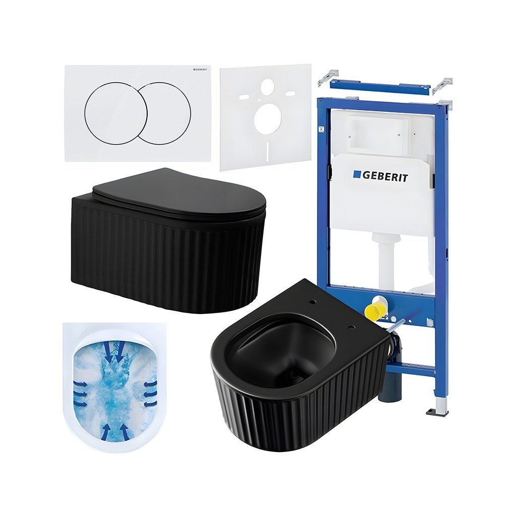 Podomítkový WC set Geberit DuoFix s WC mísou LA-MTB-RIM-03 je kompletní řešení pro moderní koupelny, které spojuje elegantní design, funkčnost a vysokou odolnost. Tento set zahrnuje podomítkový instalační rám, závěsnou bezokrajovou WC mísu, zvukoizolační vložku a dvoudílné ovládací tlačítko. Všechny komponenty jsou součástí balení, takže není třeba nic dokupovat zvlášť.