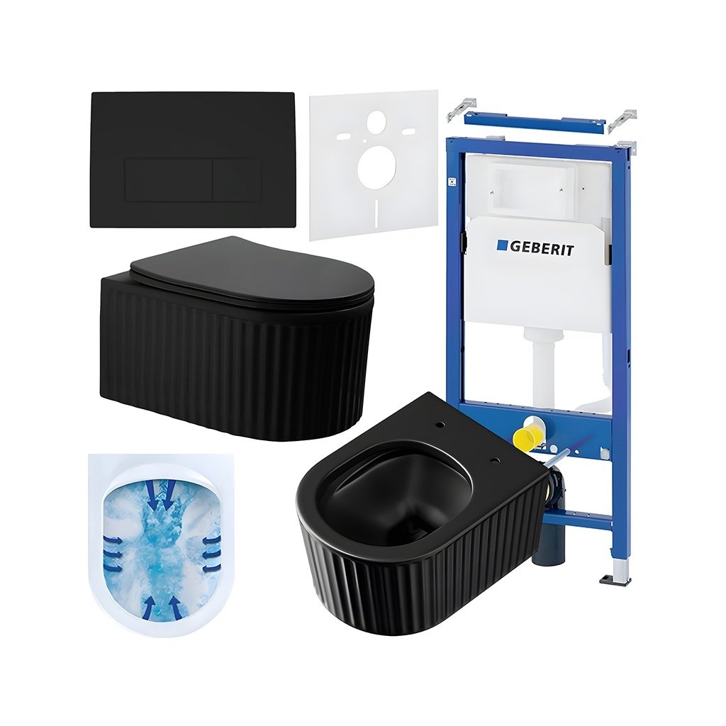Podomítkový WC set Geberit DuoFix s WC mísou LA-MTB-RIM-03 je kompletní řešení pro moderní koupelny, které spojuje elegantní design, funkčnost a vysokou odolnost. Tento set zahrnuje podomítkový instalační rám, závěsnou bezokrajovou WC mísu, zvukoizolační vložku a dvoudílné ovládací tlačítko. Všechny komponenty jsou součástí balení, takže není třeba nic dokupovat zvlášť.