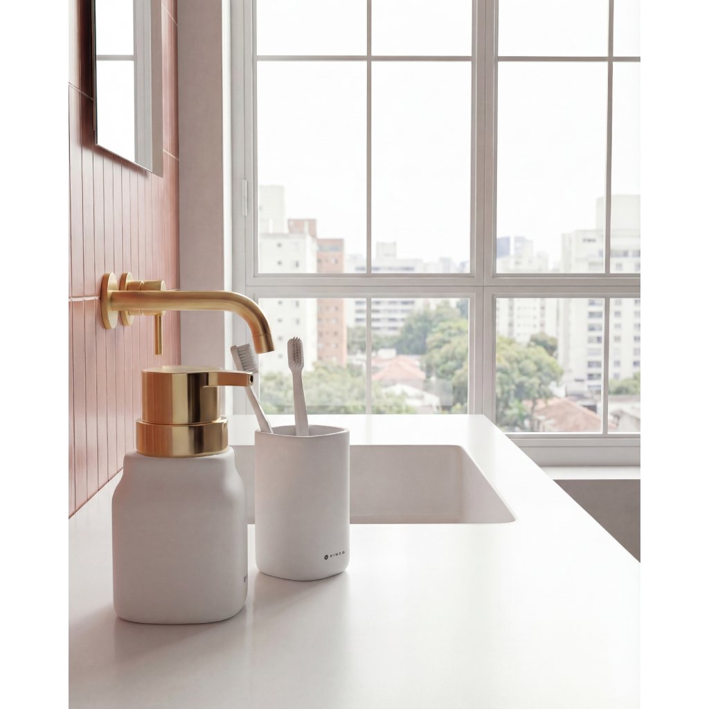 Pohárek lze doplnit také o další výrobky stejné designové řady, jako dávkovač mýdla.