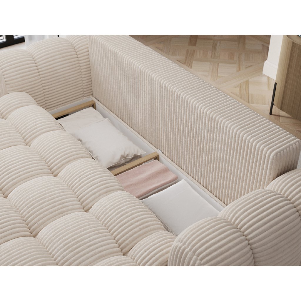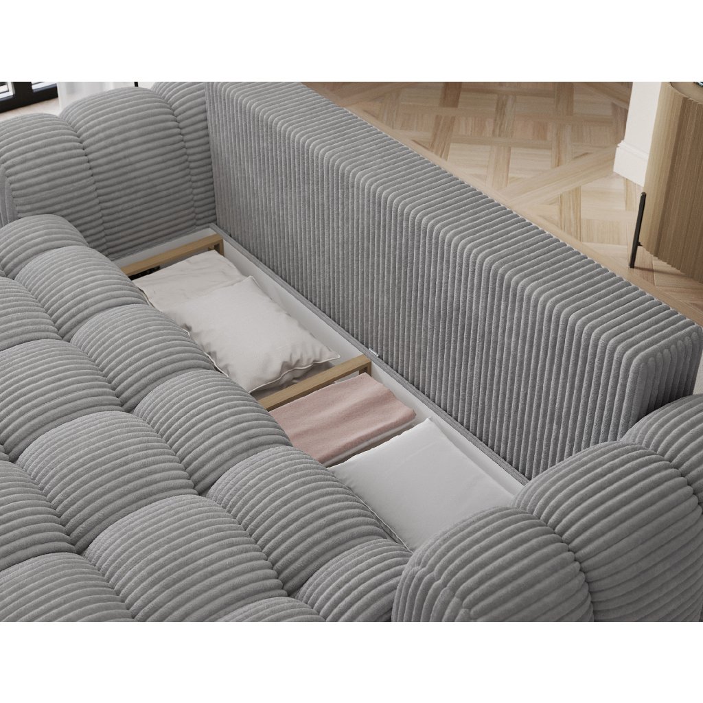 Pohovka Cotonn o rozměrech 256 x 105 x 119 cm je moderní pohovka s funkcí spaní a ukládacím prostorem na lůžkoviny, která kombinuje elegantní design s výjimečným komfortem.Sedačka je vyplněna vlnitou pružinou typu B a pěnou HR3030 a T2315, která poskytuje vynikající oporu a pohodlí při sezení i spaní. Díky použitému mechanismu Dolphin je rozkládání pohovky rychlé a intuitivní a objemný prostor na lůžkoviny umožňuje pohodlné uložení textilií.