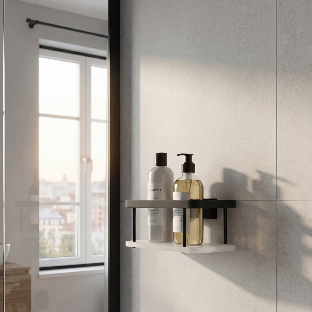 Černá polička z akrylového skla s matně černou kovovou ohrádkou určená do sprchy nebo k vaně. Minimalistický design koupelnové poličky umocňují použité materiály a vyfrézované otvory pro lepší odkapávání vody. Odkládací plocha poličky je vyrobena z matně bílého akrylového skla o tloušťce 8 mm. Nosnost poličky 2 kg. Montáž lepením, vrtáním. Lepidlo MAMUT není součástí balení výrobku. Lze je dokoupit pod artiklovým číslem 35003TU.VŠEOBECNÝ NÁVOD K MONTÁŽI VÝROBKŮ