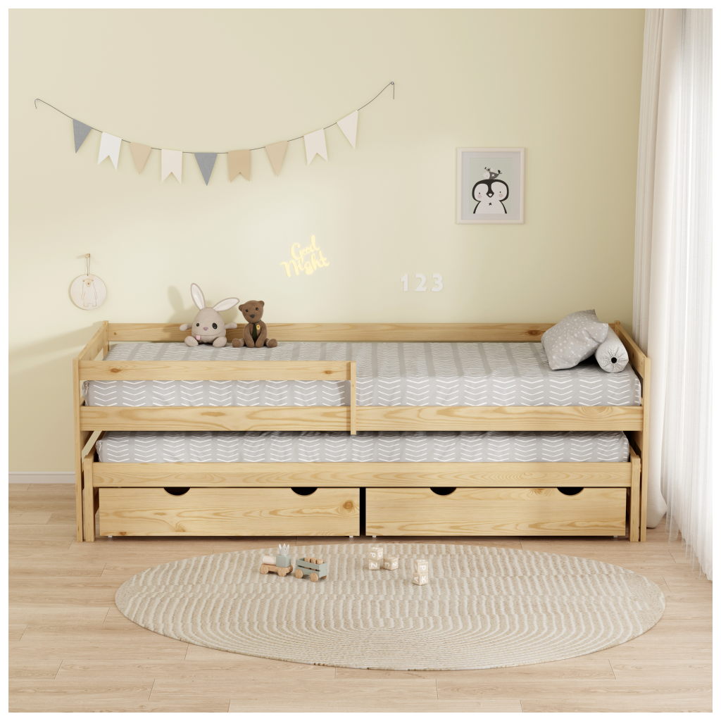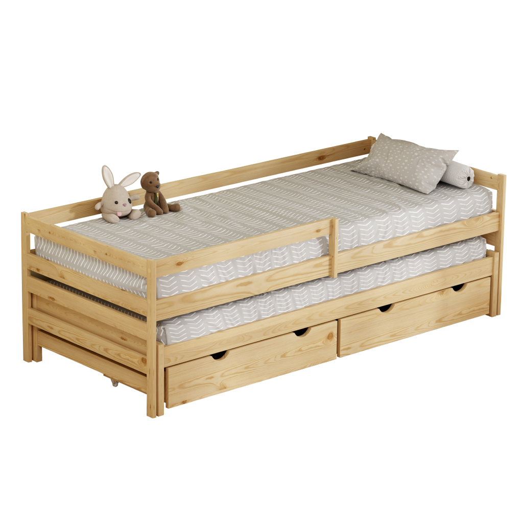 Tento model je navržen s ohledem na maximální využití prostoru a praktičnost. Integrovaná přistýlka je perfektním řešením pro sourozence nebo občasné přespání kamarádů, zatímco úložné prostory v podobě šuplíků na kolečkách poskytují dostatek místa pro lůžkoviny či hračky. Bezpečnostní bariéra, kterou lze namontovat na levou i pravou stranu, zajišťuje klidný spánek i těm nejmenším.