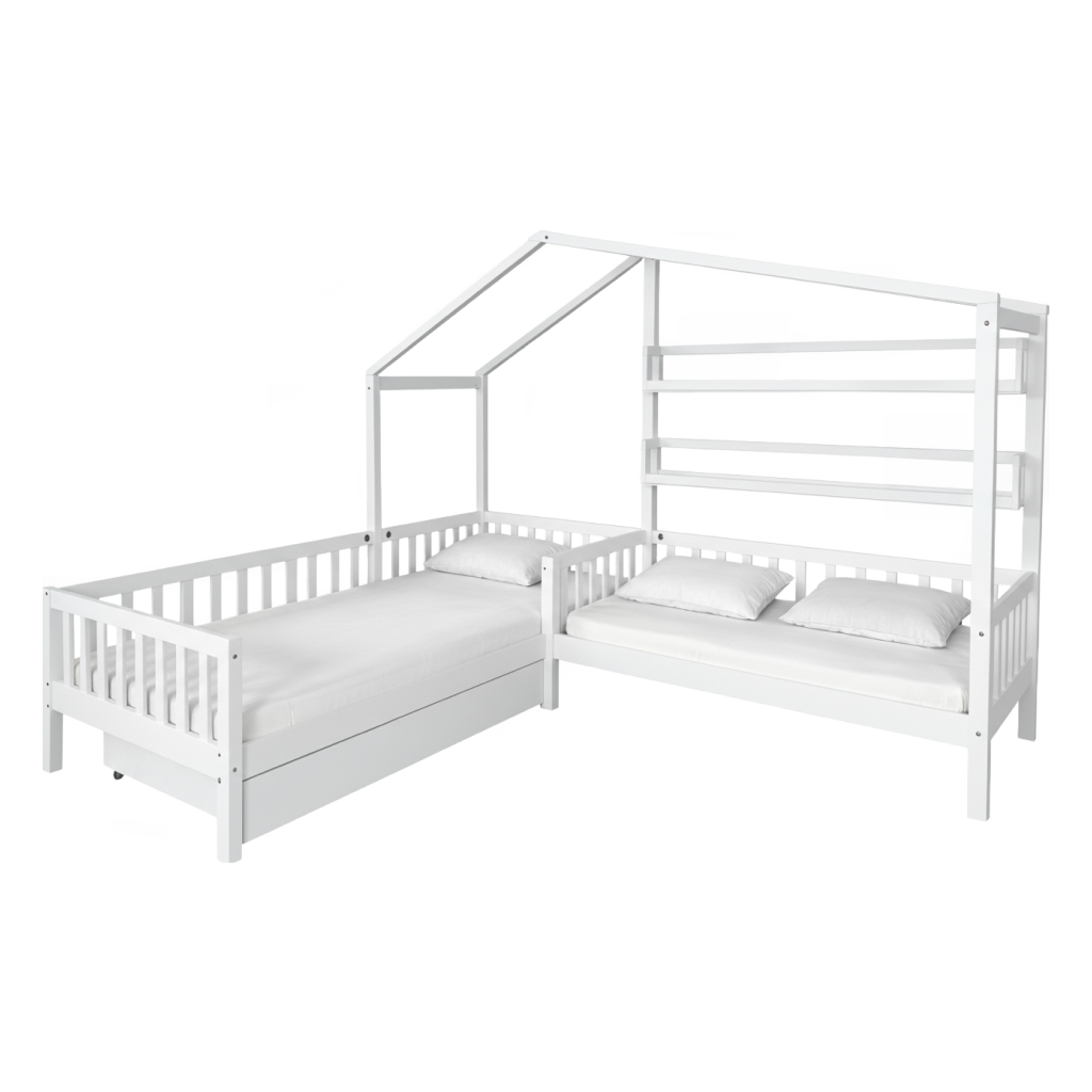 Dětská postel ENOLA představuje ideální řešení pro sourozence, kteří sdílejí společný pokoj. Tato unikátní postel ve tvaru domečku a písmene L vnáší do dětského interiéru hravost a útulnou atmosféru. Bílé barevné provedení působí svěže a nadčasově, díky čemuž se postel snadno kombinuje s ostatním nábytkem a různými barevnými doplňky.