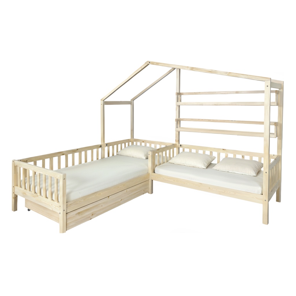 - Vlastnosti: postel ve tvaru domečku, tvar písmene L, rohová