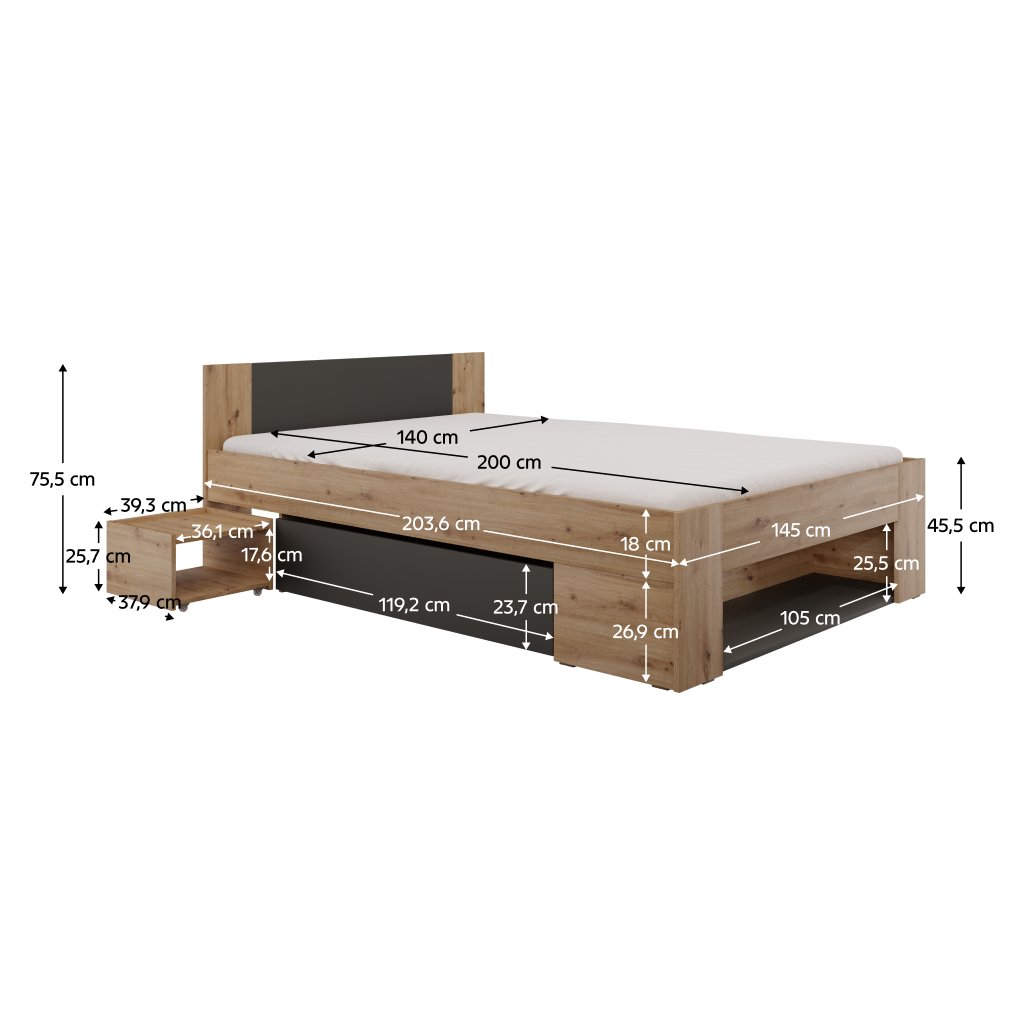 Postel s úložným prostorem, 140x200, dub artisan/antracit, UNIS