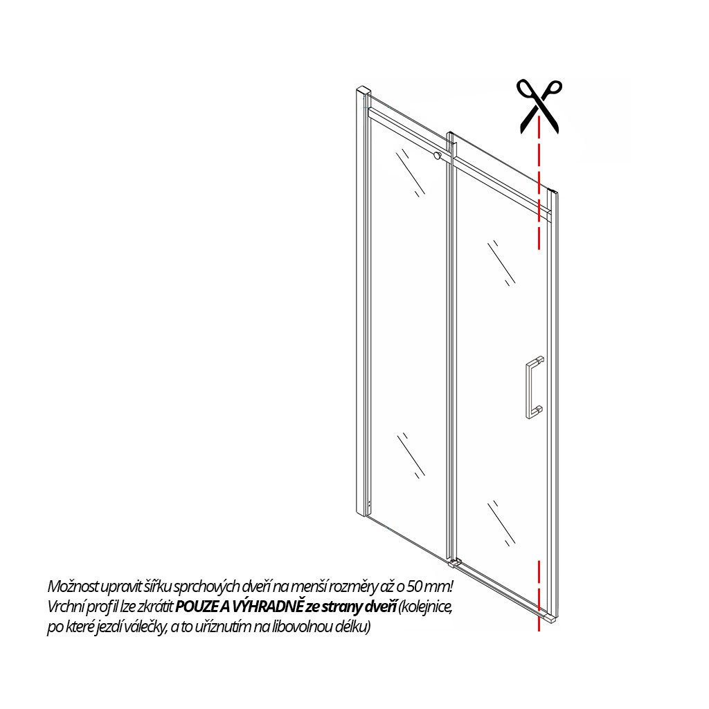 - možnost upravit šířku sprchových dveří na menší rozměry až o 50 mm! Vrchní profil si musíte sami zkrátit POUZE A VÝHRADNĚ ze strany dveří (kolejnice, po které jezdí válečky, a to uříznutím na libovolnou délku)