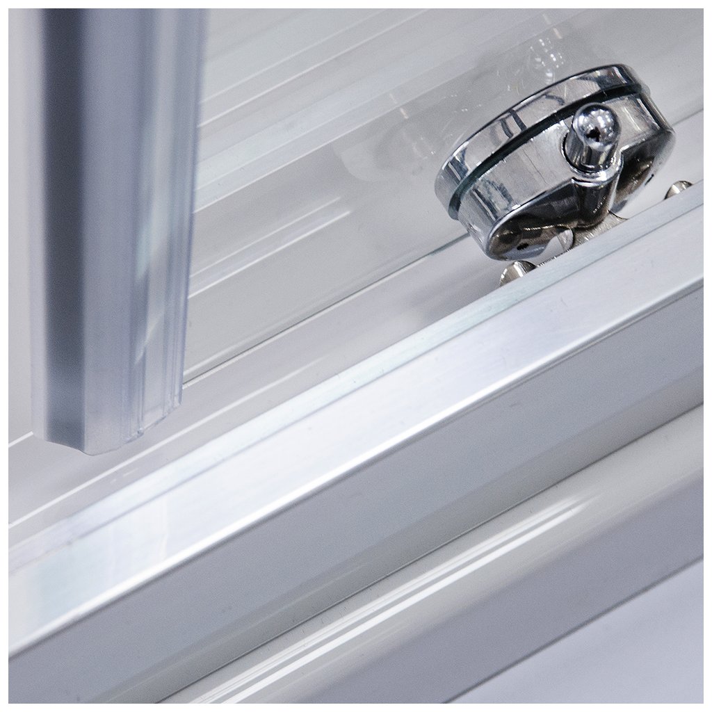 Dveře můžete odklopit velmi jednoduše. Jak můžete vidět na obrázku, na pojezdech se nachází stříbrný "čudlík". Čudlík stlačte směrem dolů a následně dveře už jen odklopíte od lišty. Je nutné oba dva čudlíky na obou pojezdech stlačit najednou, abyste sklo mohli bez problému odklopit. Dveře se však dají vyklopit pouze v dolní části, v horní části zůstávají stále připevněné, což zajišťuje, že na vás dveře nespadnou a nezpůsobí žádný úraz. Po vyčištění pojezdy jen nacvaknete zpět do lišty.