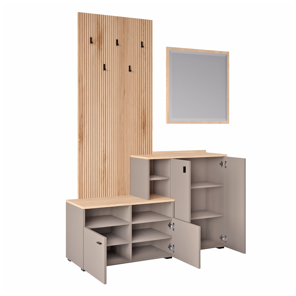Funkčnost je u tohoto modelu na prvním místě. Sestava nabízí bohatý úložný prostor v podobě policové skříňky a otevřených ploch, které jsou doplněny o praktickou věšákovou stěnu s háčky pro snadné odkládání svršků. Integrované zrcadlo s leštěnými hranami nejen opticky zvětší prostor vaší předsíně, ale také vám umožní rychlou kontrolu vzhledu před odchodem z domova. Celá konstrukce stojí na pevných nožkách, které usnadňují úklid pod nábytkem.
