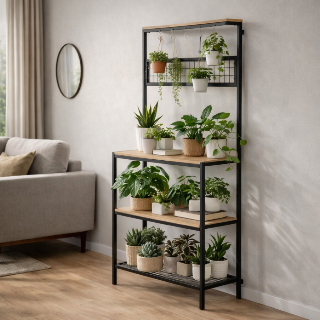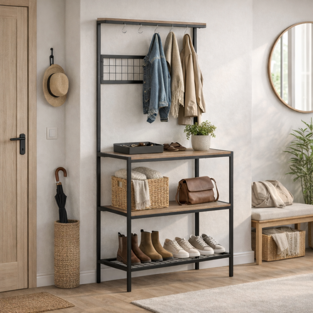Tento regál nabízí otevřený úložný prostor rozdělený do tří polic, které doplňuje praktický systém pěti háčků. Je ideálním řešením pro ty, kteří hledají jednoduchý, ale efektivní způsob organizace domácnosti. Kombinace kovové konstrukce a laminované MDF desky vytváří nadčasový vzhled, který podtrhuje industriální charakter a dodává místnosti osobitý šmrnc.