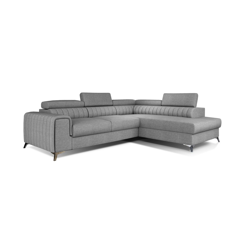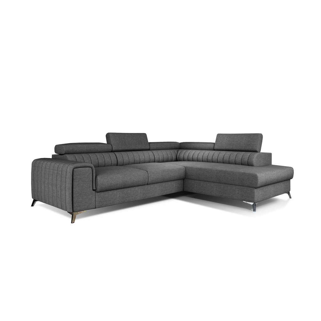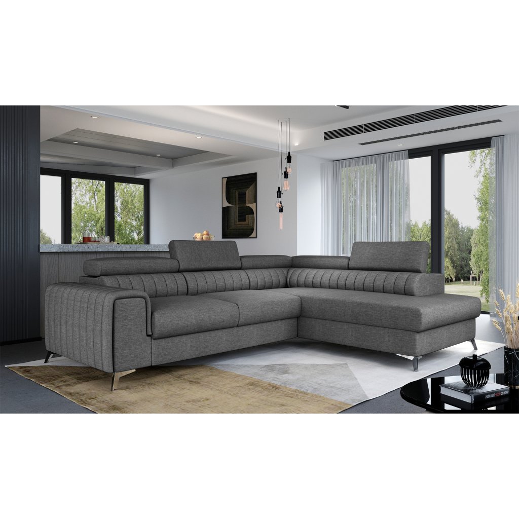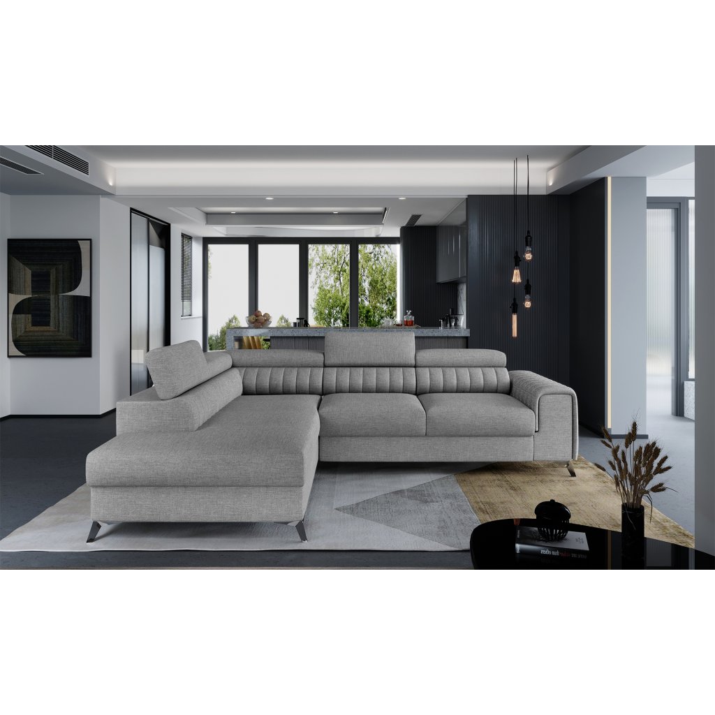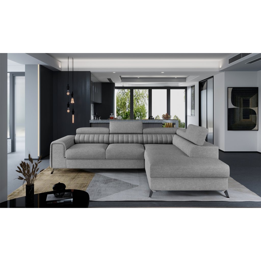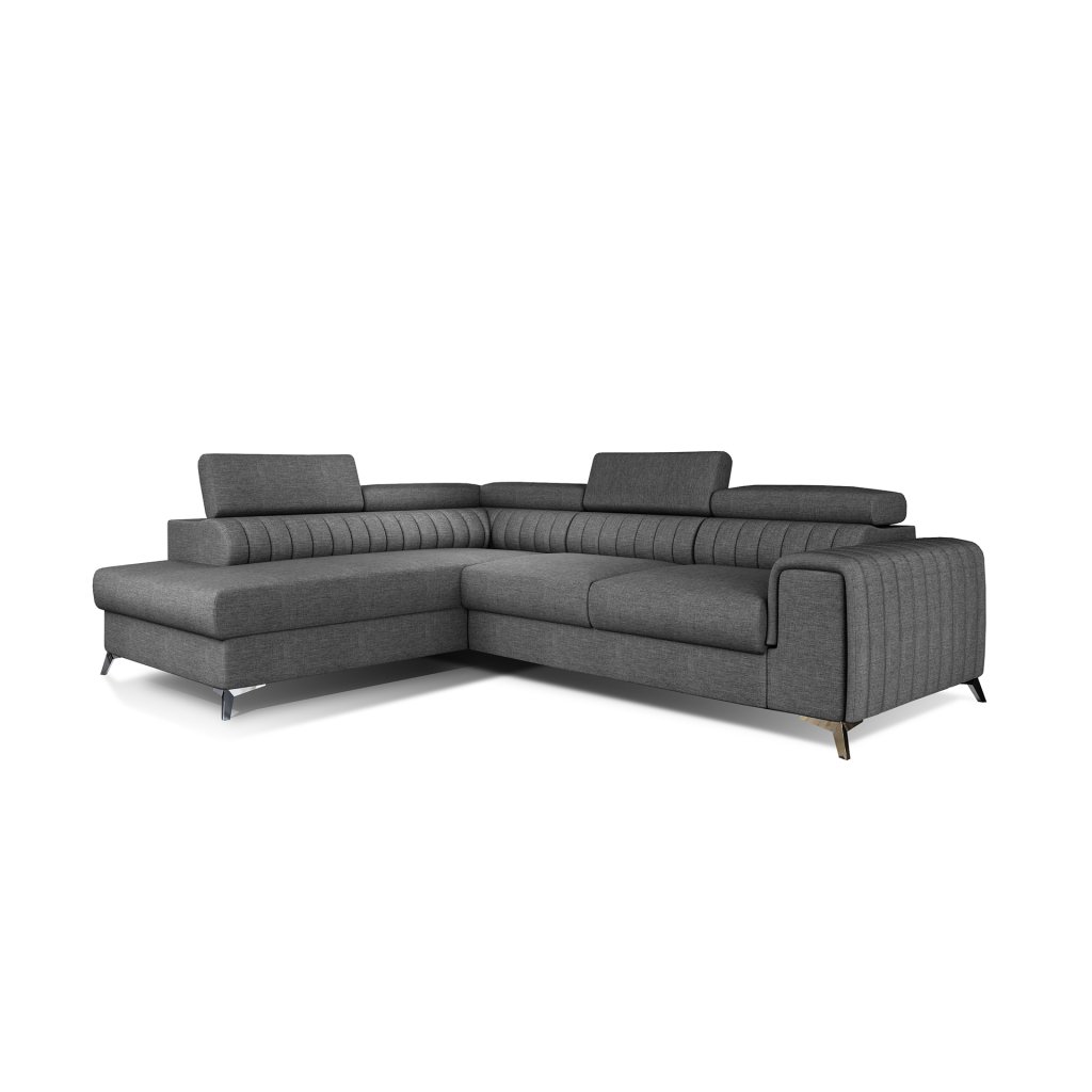Laurence je stylová, funkční a především elegantní rohová pohovka pro náročné znalce pohodlí. Vysoký komfort odpočinku umocňují nastavitelné, vysoké opěrky hlavy a široký sedák. Nábytek o rozměrech 278 x 205 x 92 cm je vyroben z vlnitých pružin typu B, T30 a HR pěny, které zajistí nejvyšší komfort při každodenním používání pohovky ve dne i při spaní po setmění, neboť díky funkci delfín je rohová pohovka Laurence vhodná i pro noční odpočinek.Rohová sedací souprava ve tvaru L je vybavena funkcí lůžka o rozměrech 123 x 193 cm. Kromě toho má také velkorysý kontejner na lůžkoviny. Díky elegantnímu prošití a ocelovým nožkám o průměru 9 cm je rohová pohovka udržována v moderním stylu zpracování.