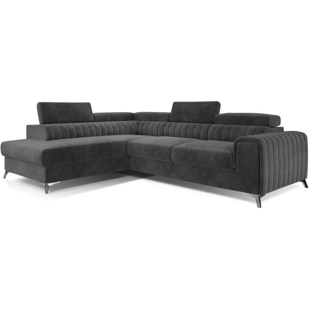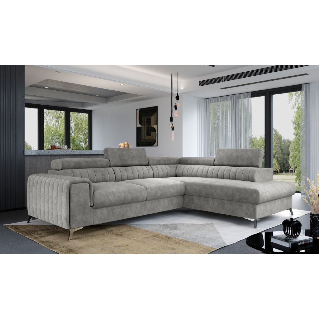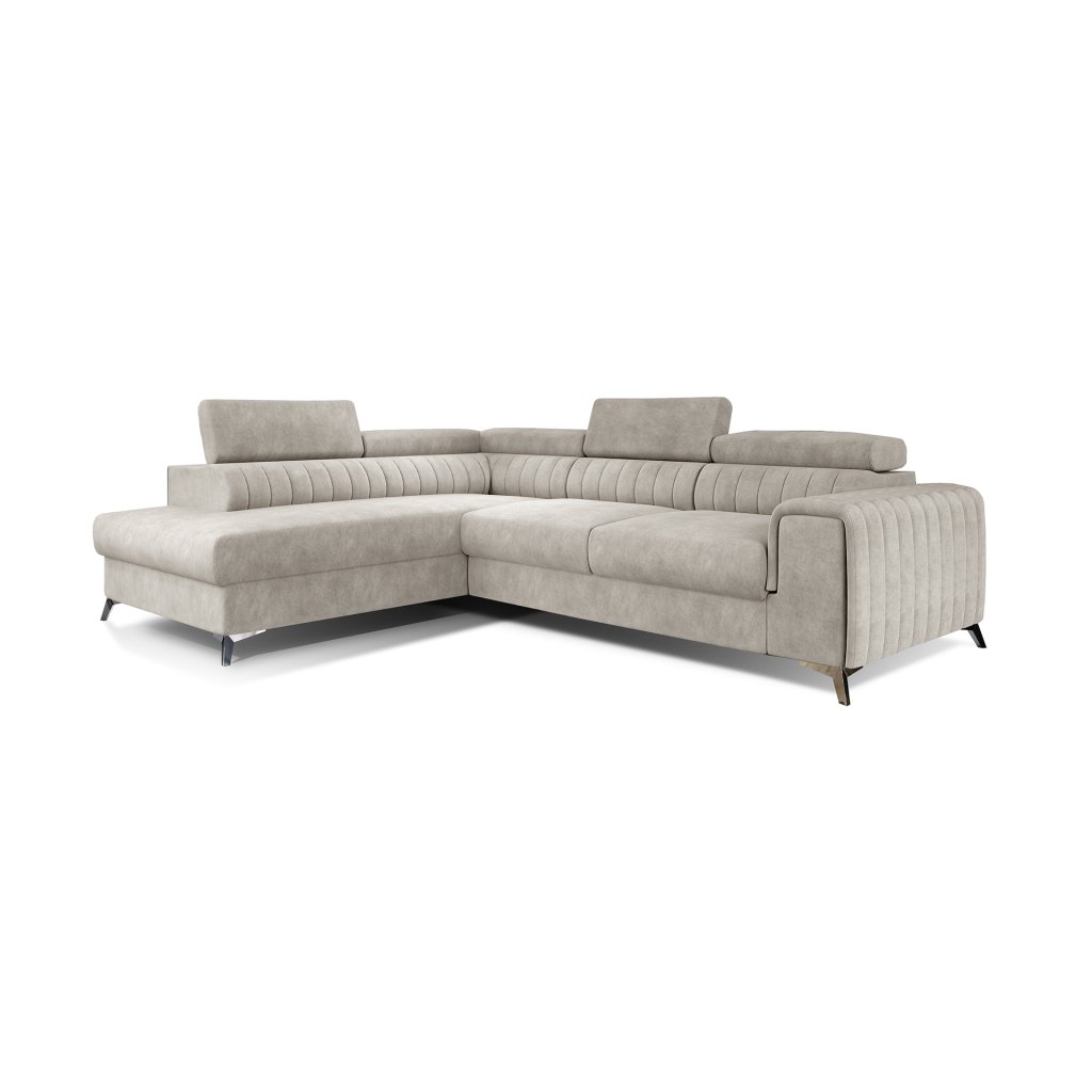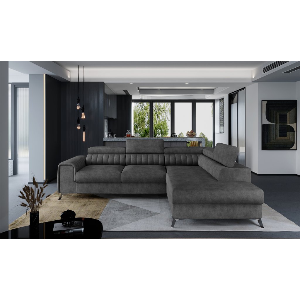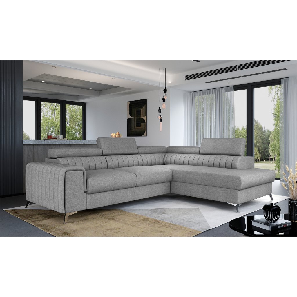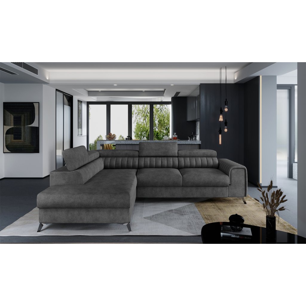 Laurence je stylová, funkční a především elegantní rohová pohovka pro náročné znalce pohodlí. Vysoký komfort odpočinku umocňují nastavitelné, vysoké opěrky hlavy a široký sedák. Nábytek o rozměrech 278 x 205 x 92 cm je vyroben z vlnitých pružin typu B, T30 a HR pěny, které zajistí nejvyšší komfort při každodenním používání pohovky ve dne i při spaní po setmění, neboť díky funkci delfín je rohová pohovka Laurence vhodná i pro noční odpočinek.Rohová sedací souprava ve tvaru L je vybavena funkcí lůžka o rozměrech 123 x 193 cm. Kromě toho má také velkorysý kontejner na lůžkoviny. Díky elegantnímu prošití a ocelovým nožkám o průměru 9 cm je rohová pohovka udržována v moderním stylu zpracování.