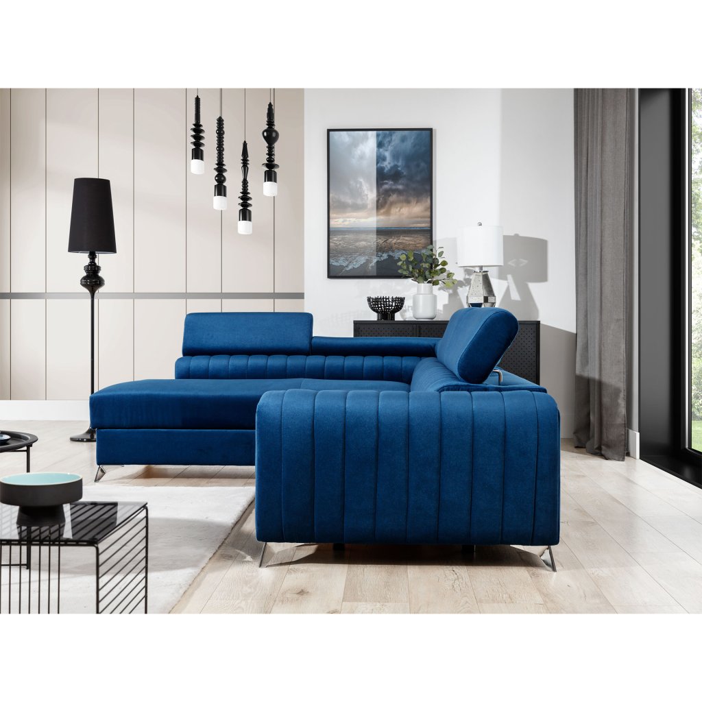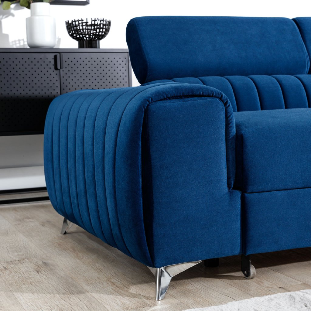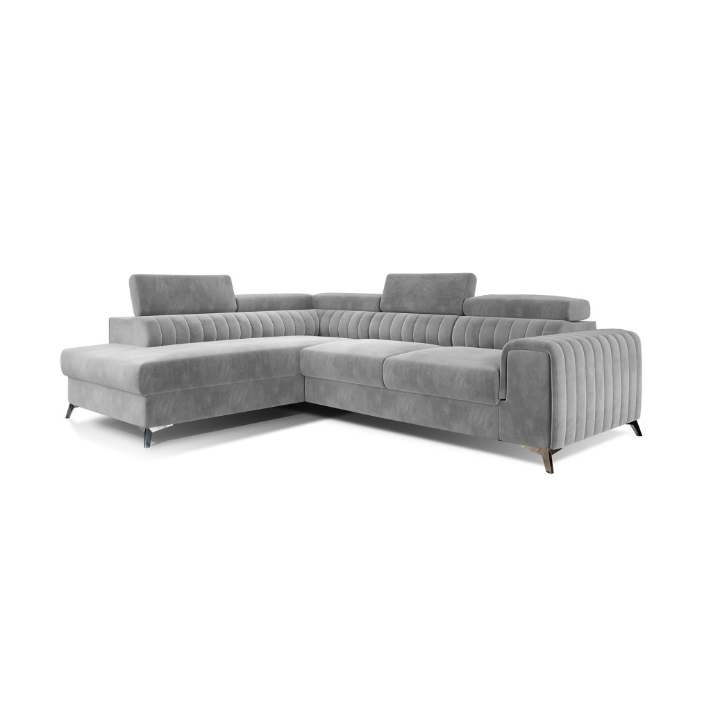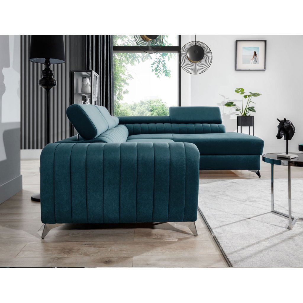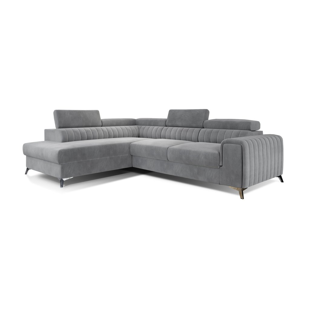 Laurence je stylová, funkční a především elegantní rohová pohovka pro náročné znalce pohodlí. Vysoký komfort odpočinku umocňují nastavitelné, vysoké opěrky hlavy a široký sedák. Nábytek o rozměrech 278 x 205 x 92 cm je vyroben z vlnitých pružin typu B, T30 a HR pěny, které zajistí nejvyšší komfort při každodenním používání pohovky ve dne i při spaní po setmění, neboť díky funkci delfín je rohová pohovka Laurence vhodná i pro noční odpočinek.Rohová sedací souprava ve tvaru L je vybavena funkcí lůžka o rozměrech 123 x 193 cm. Kromě toho má také velkorysý kontejner na lůžkoviny. Díky elegantnímu prošití a ocelovým nožkám o průměru 9 cm je rohová pohovka udržována v moderním stylu zpracování.