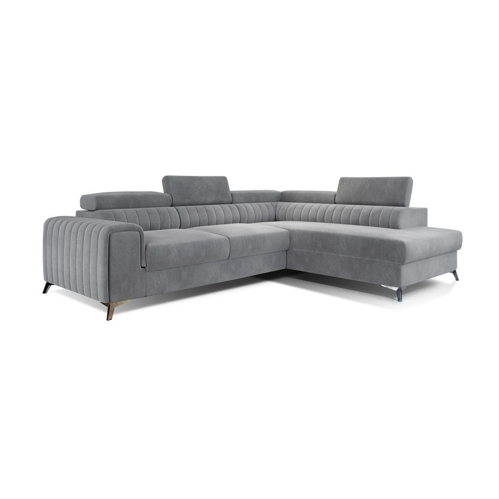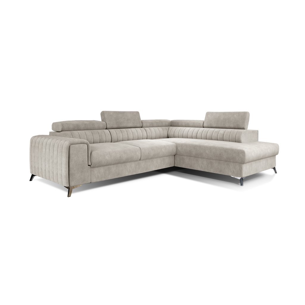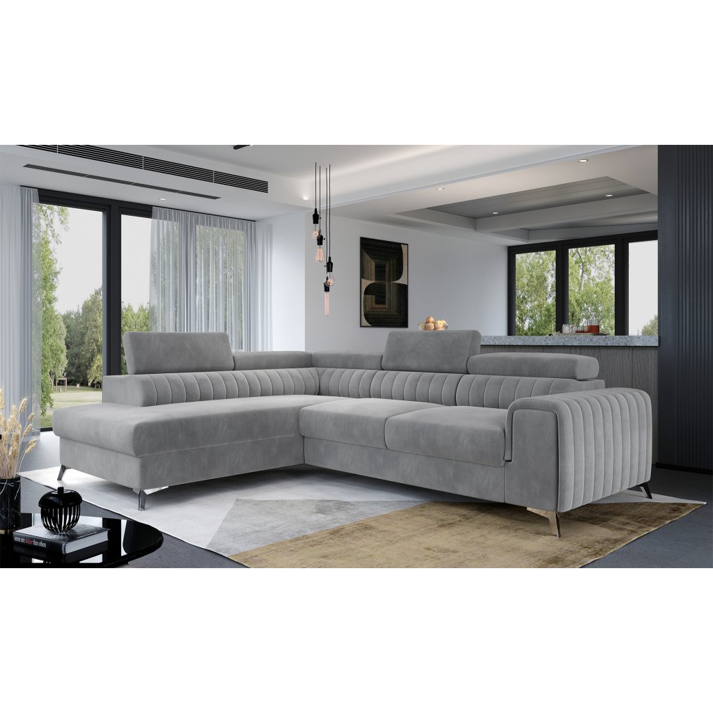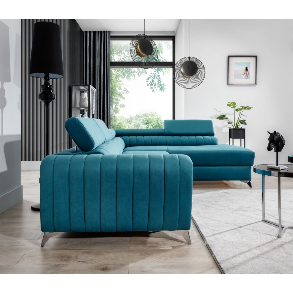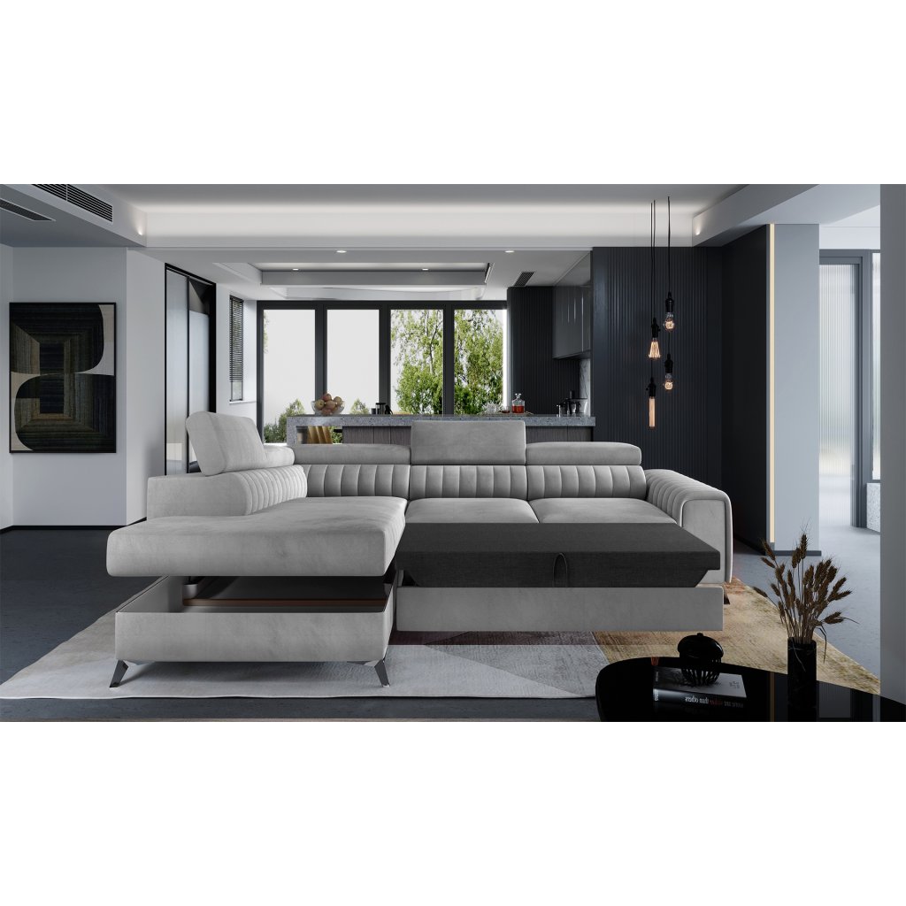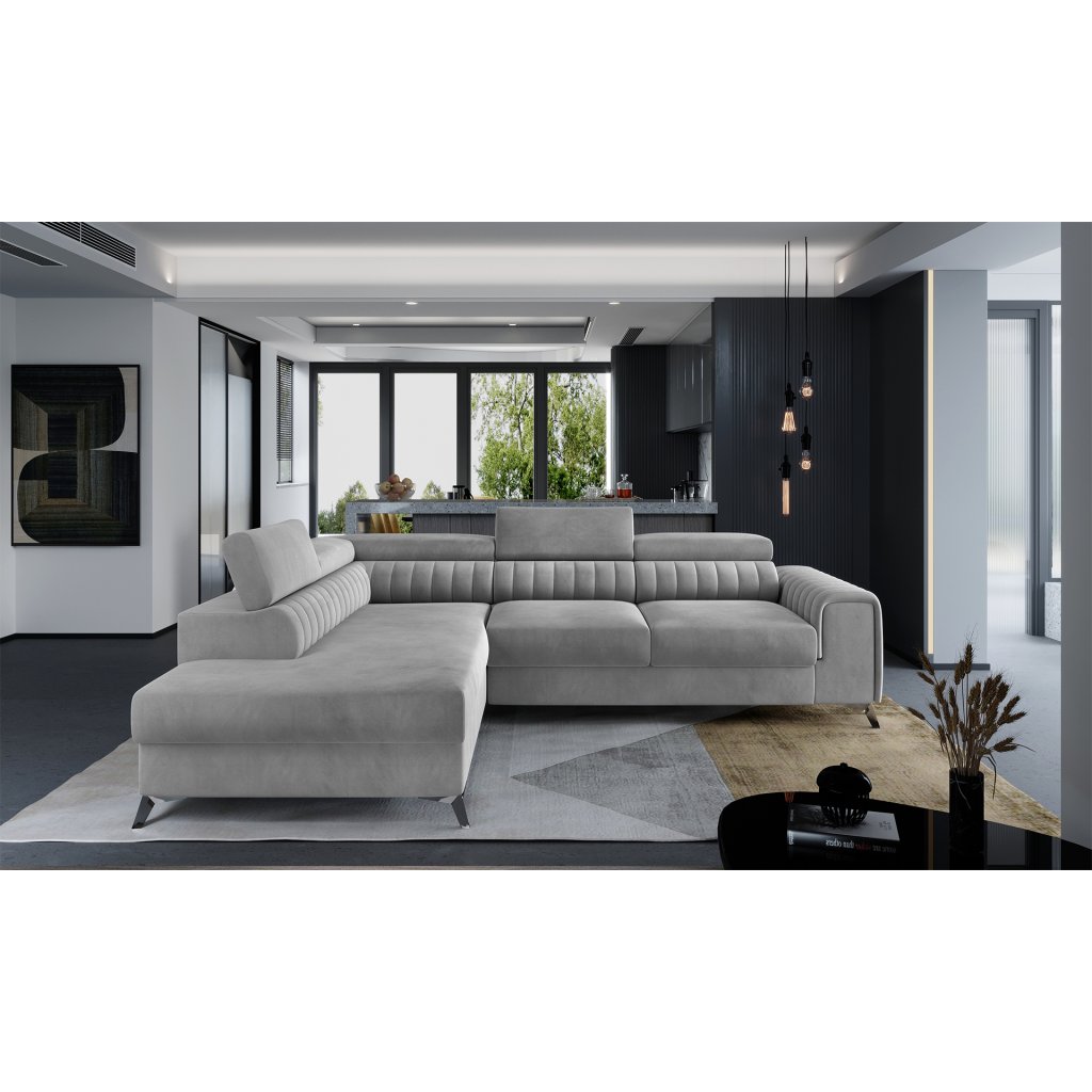 Laurence je stylová, funkční a především elegantní rohová pohovka pro náročné znalce pohodlí. Vysoký komfort odpočinku umocňují nastavitelné, vysoké opěrky hlavy a široký sedák. Nábytek o rozměrech 278 x 205 x 92 cm je vyroben z vlnitých pružin typu B, T30 a HR pěny, které zajistí nejvyšší komfort při každodenním používání pohovky ve dne i při spaní po setmění, neboť díky funkci delfín je rohová pohovka Laurence vhodná i pro noční odpočinek.Rohová sedací souprava ve tvaru L je vybavena funkcí lůžka o rozměrech 123 x 193 cm. Kromě toho má také velkorysý kontejner na lůžkoviny. Díky elegantnímu prošití a ocelovým nožkám o průměru 9 cm je rohová pohovka udržována v moderním stylu zpracování.
