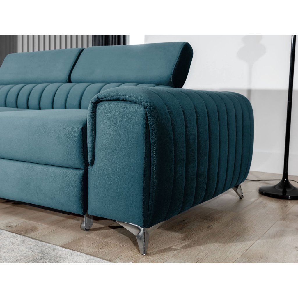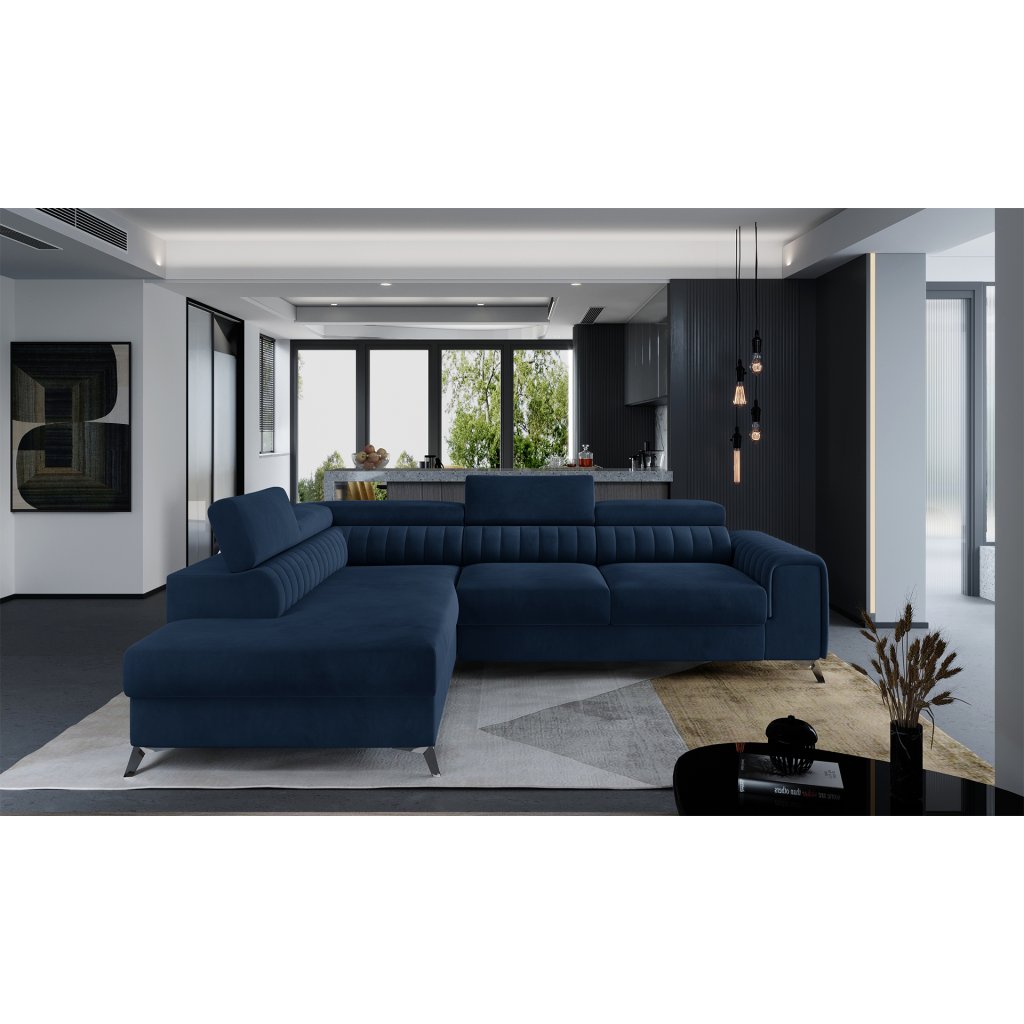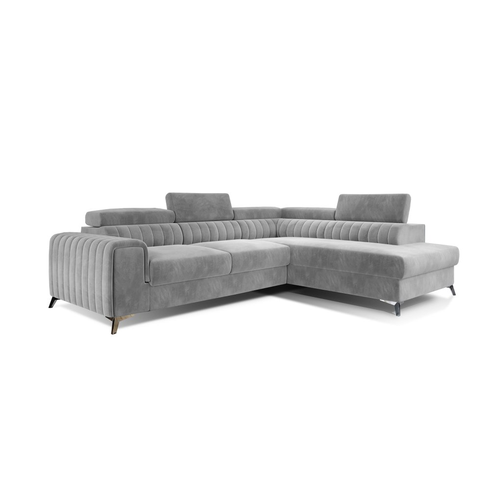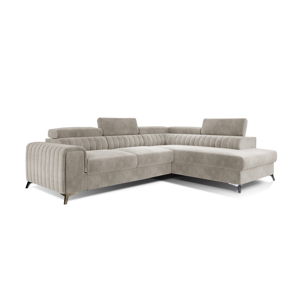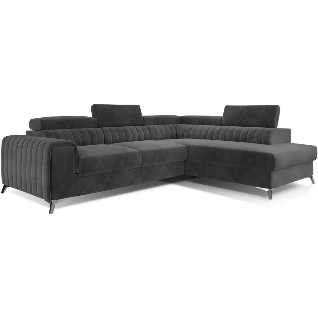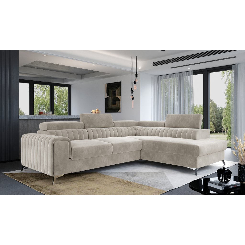 Laurence je stylová, funkční a především elegantní rohová pohovka pro náročné znalce pohodlí. Vysoký komfort odpočinku umocňují nastavitelné, vysoké opěrky hlavy a široký sedák. Nábytek o rozměrech 278 x 205 x 92 cm je vyroben z vlnitých pružin typu B, T30 a HR pěny, které zajistí nejvyšší komfort při každodenním používání pohovky ve dne i při spaní po setmění, neboť díky funkci delfín je rohová pohovka Laurence vhodná i pro noční odpočinek.Rohová sedací souprava ve tvaru L je vybavena funkcí lůžka o rozměrech 123 x 193 cm. Kromě toho má také velkorysý kontejner na lůžkoviny. Díky elegantnímu prošití a ocelovým nožkám o průměru 9 cm je rohová pohovka udržována v moderním stylu zpracování.