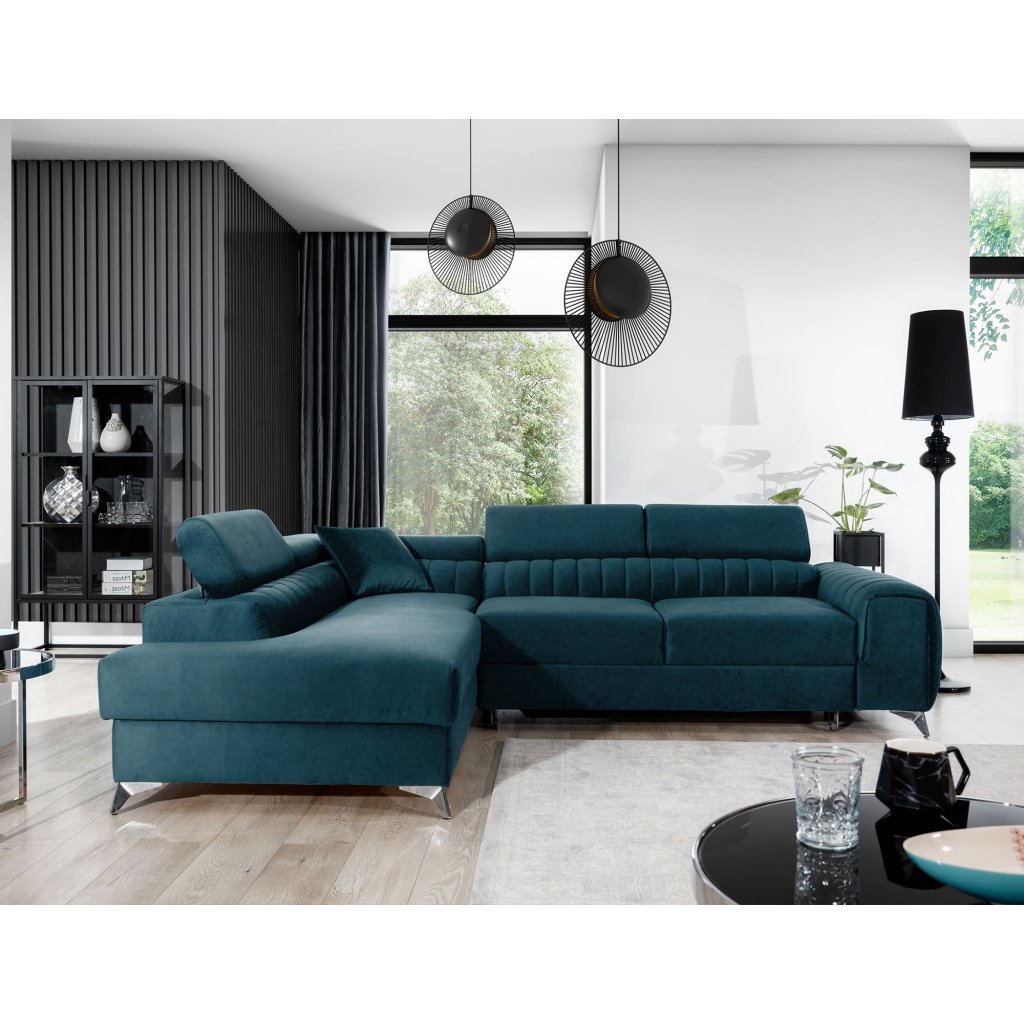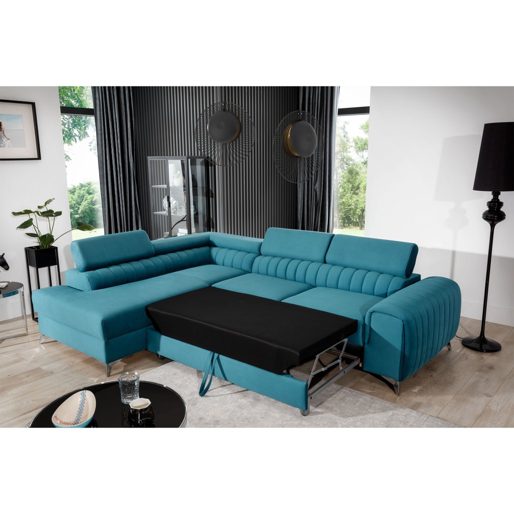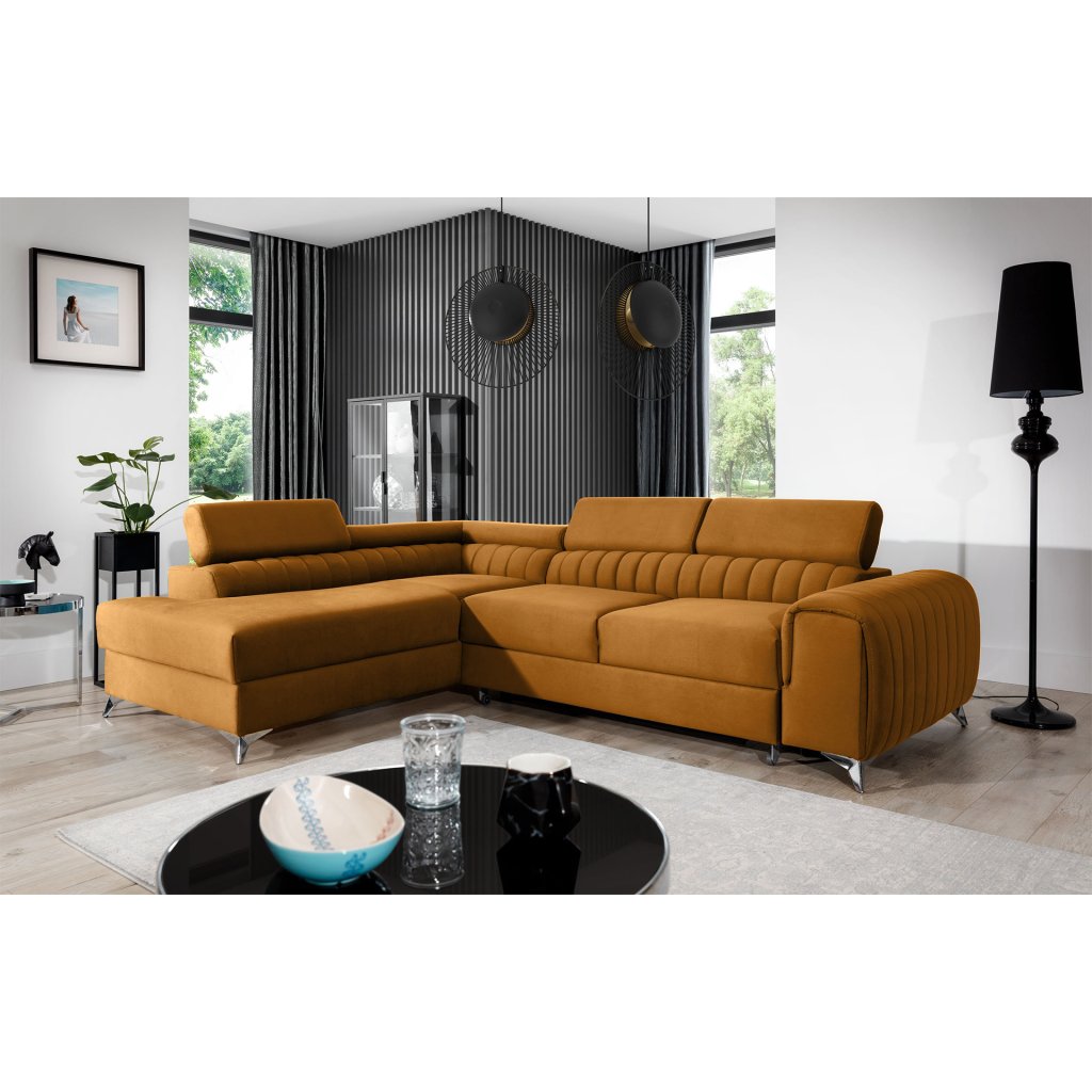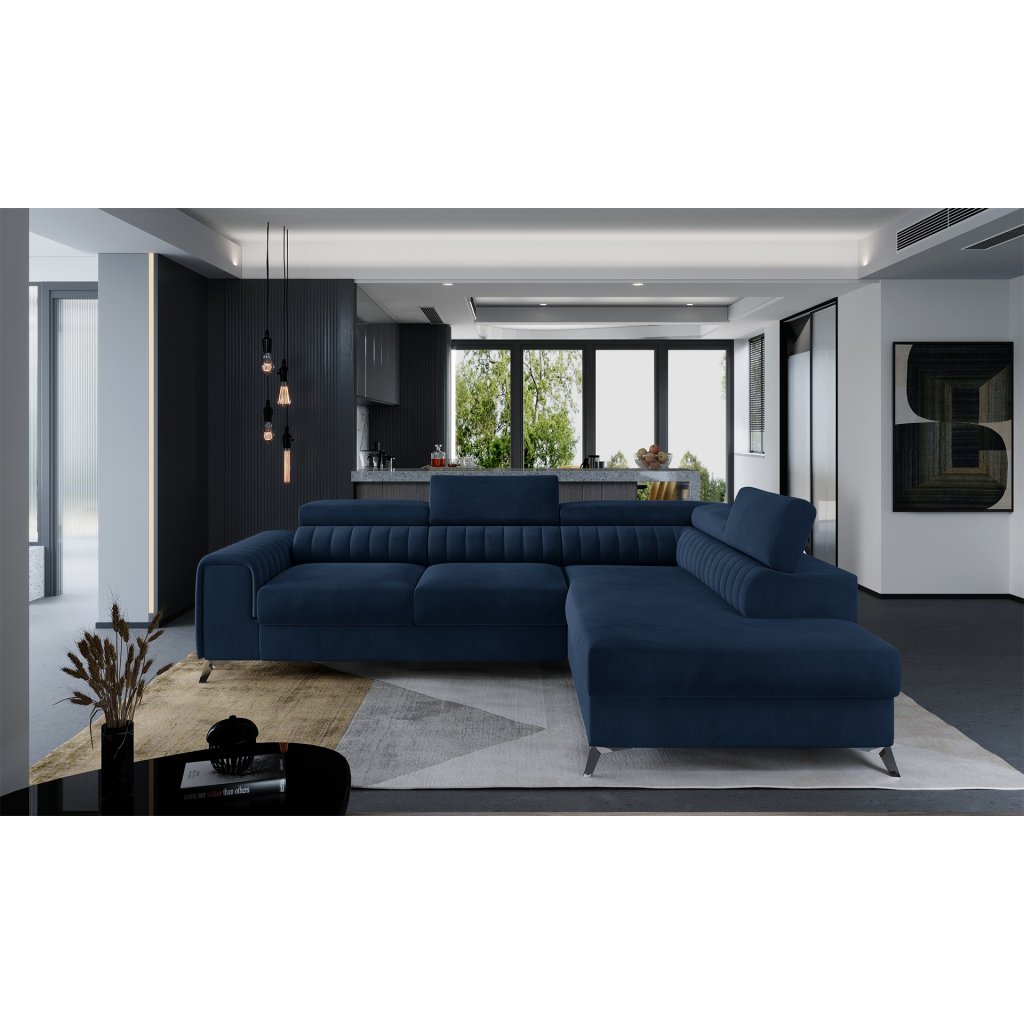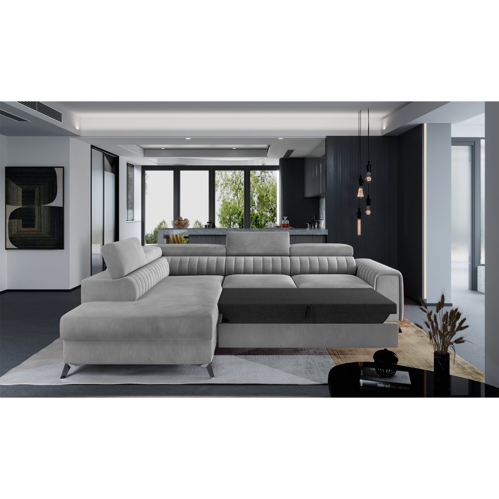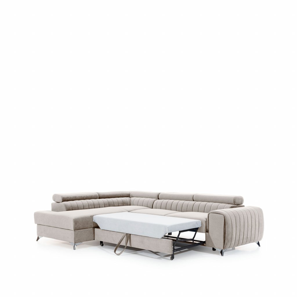 Laurence je stylová, funkční a především elegantní rohová pohovka pro náročné znalce pohodlí. Vysoký komfort odpočinku umocňují nastavitelné, vysoké opěrky hlavy a široký sedák. Nábytek o rozměrech 278 x 205 x 92 cm je vyroben z vlnitých pružin typu B, T30 a HR pěny, které zajistí nejvyšší komfort při každodenním používání pohovky ve dne i při spaní po setmění, neboť díky funkci delfín je rohová pohovka Laurence vhodná i pro noční odpočinek.Rohová sedací souprava ve tvaru L je vybavena funkcí lůžka o rozměrech 123 x 193 cm. Kromě toho má také velkorysý kontejner na lůžkoviny. Díky elegantnímu prošití a ocelovým nožkám o průměru 9 cm je rohová pohovka udržována v moderním stylu zpracování.