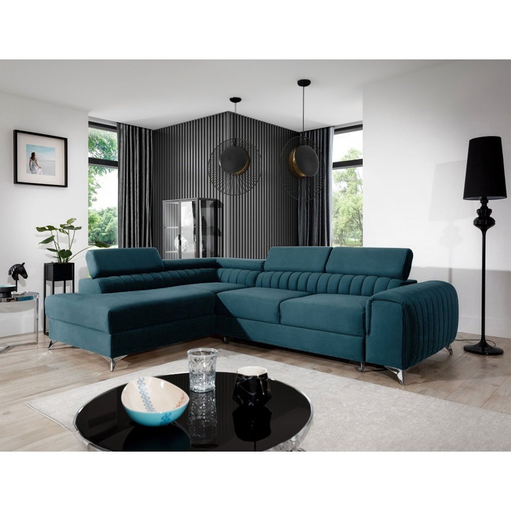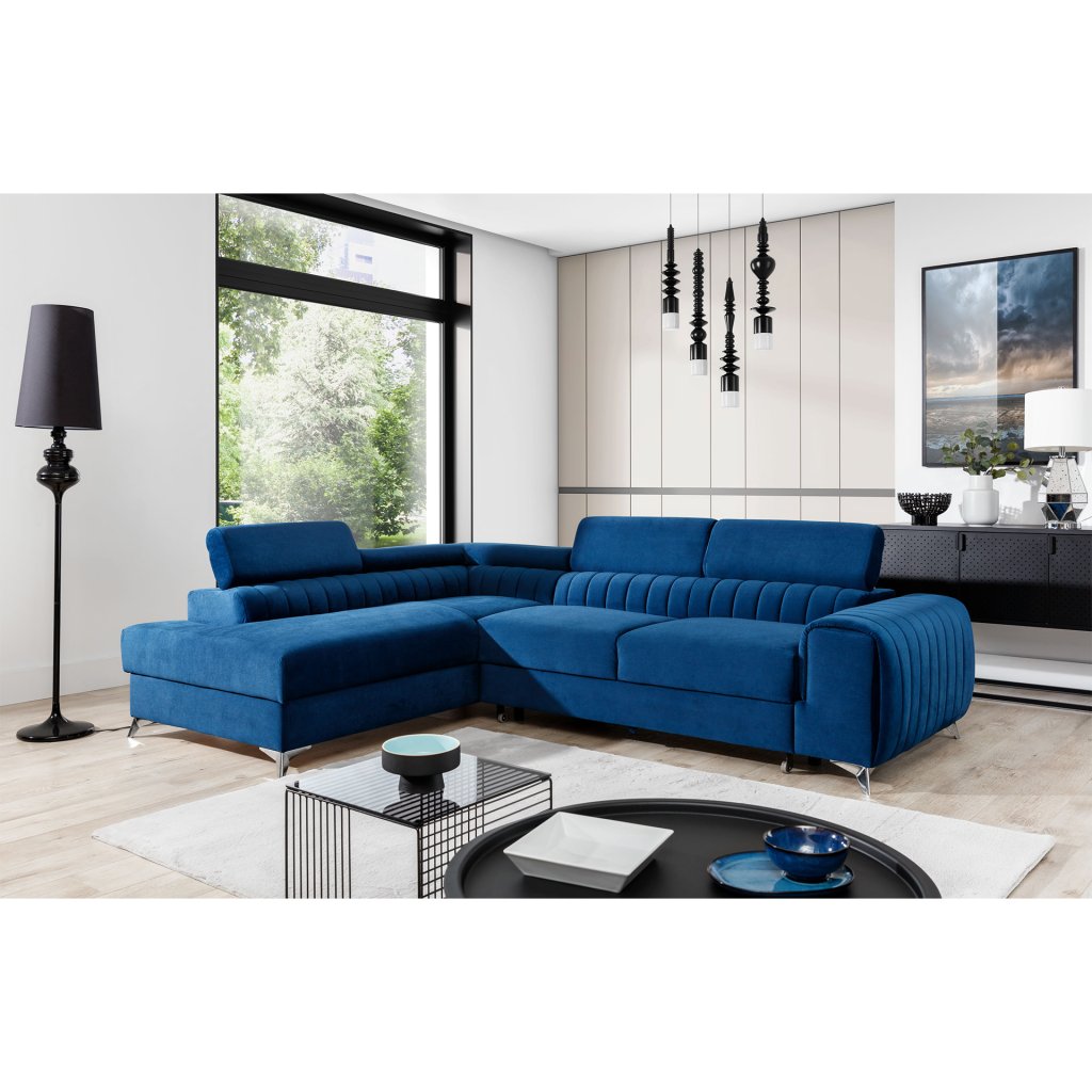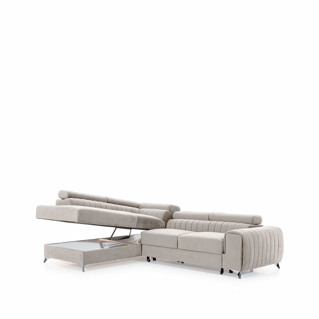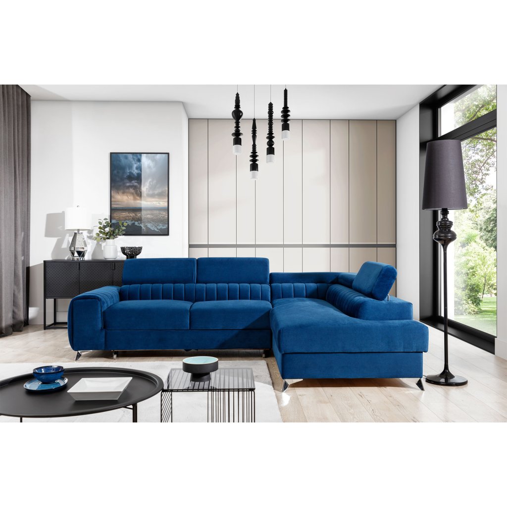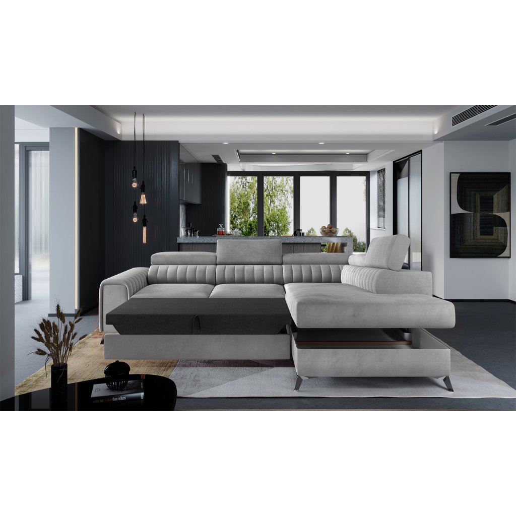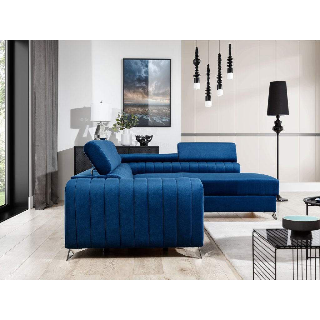 Laurence je stylová, funkční a především elegantní rohová pohovka pro náročné znalce pohodlí. Vysoký komfort odpočinku umocňují nastavitelné, vysoké opěrky hlavy a široký sedák. Nábytek o rozměrech 278 x 205 x 92 cm je vyroben z vlnitých pružin typu B, T30 a HR pěny, které zajistí nejvyšší komfort při každodenním používání pohovky ve dne i při spaní po setmění, neboť díky funkci delfín je rohová pohovka Laurence vhodná i pro noční odpočinek.Rohová sedací souprava ve tvaru L je vybavena funkcí lůžka o rozměrech 123 x 193 cm. Kromě toho má také velkorysý kontejner na lůžkoviny. Díky elegantnímu prošití a ocelovým nožkám o průměru 9 cm je rohová pohovka udržována v moderním stylu zpracování.