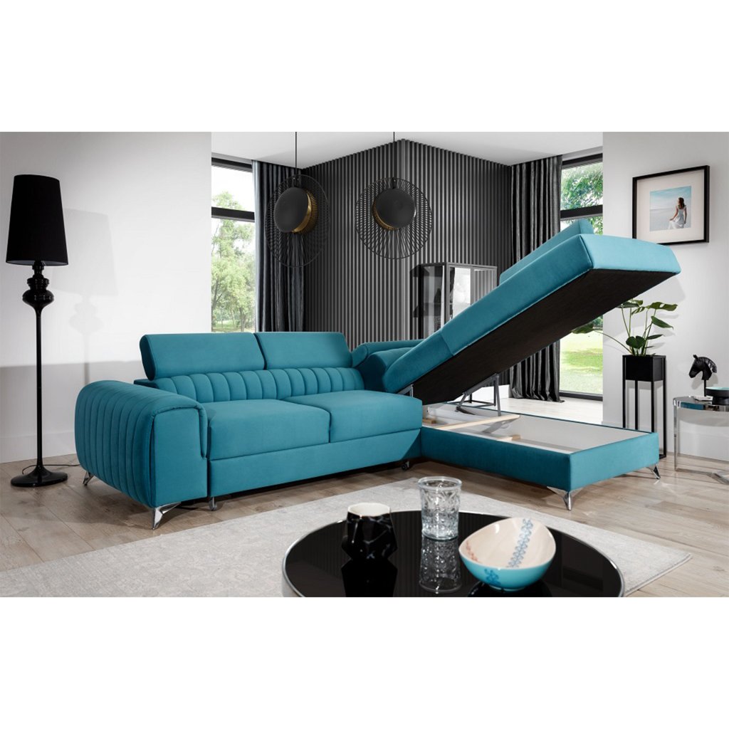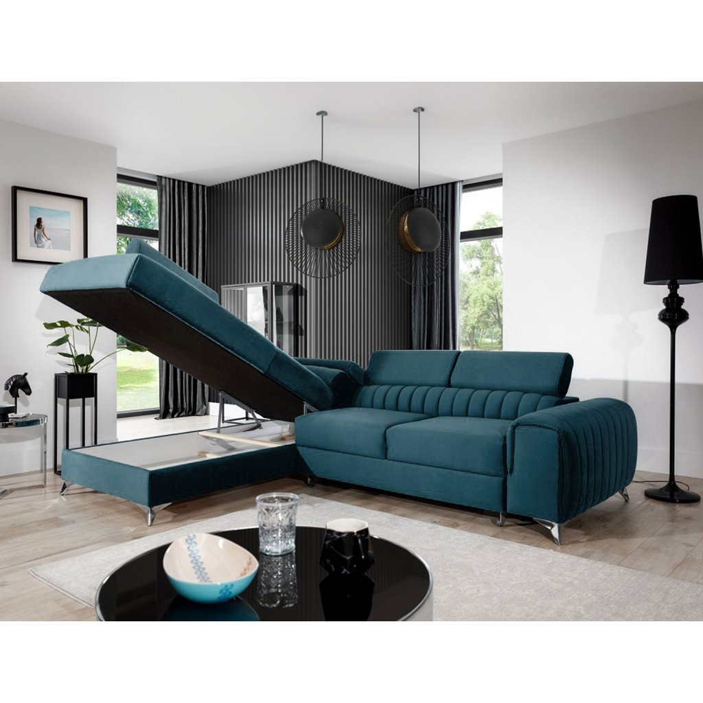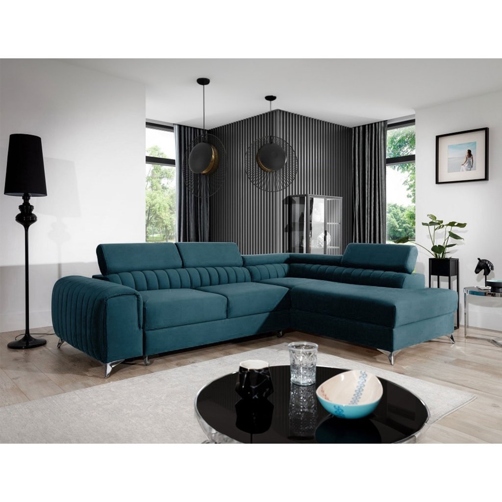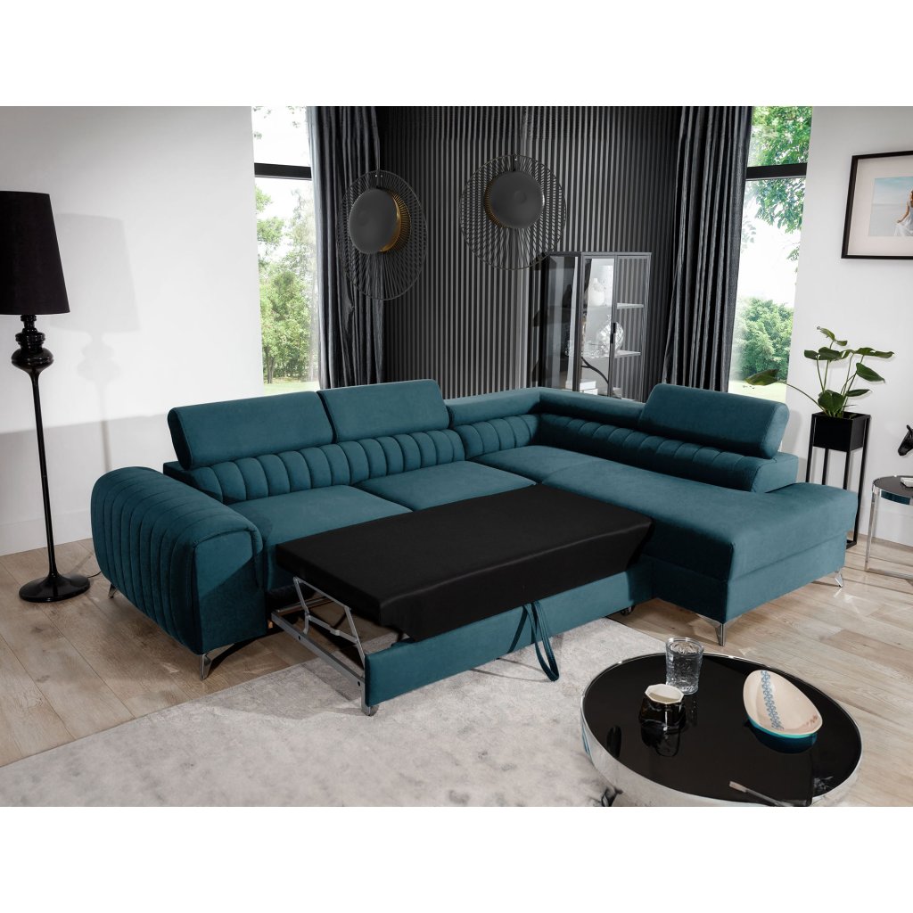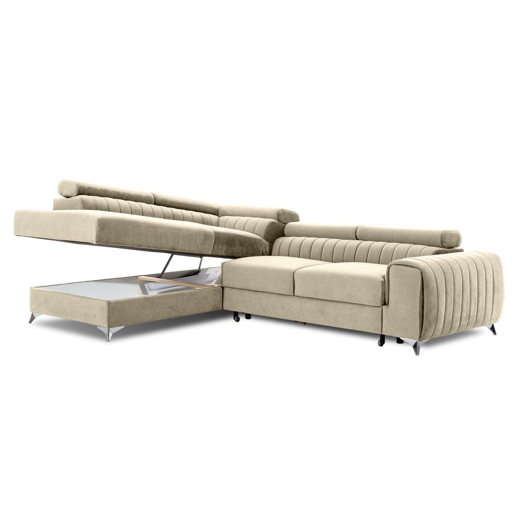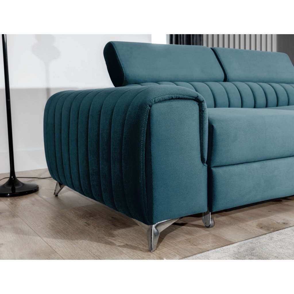 Laurence je stylová, funkční a především elegantní rohová pohovka pro náročné znalce pohodlí. Vysoký komfort odpočinku umocňují nastavitelné, vysoké opěrky hlavy a široký sedák. Nábytek o rozměrech 278 x 205 x 92 cm je vyroben z vlnitých pružin typu B, T30 a HR pěny, které zajistí nejvyšší komfort při každodenním používání pohovky ve dne i při spaní po setmění, neboť díky funkci delfín je rohová pohovka Laurence vhodná i pro noční odpočinek.Rohová sedací souprava ve tvaru L je vybavena funkcí lůžka o rozměrech 123 x 193 cm. Kromě toho má také velkorysý kontejner na lůžkoviny. Díky elegantnímu prošití a ocelovým nožkám o průměru 9 cm je rohová pohovka udržována v moderním stylu zpracování.