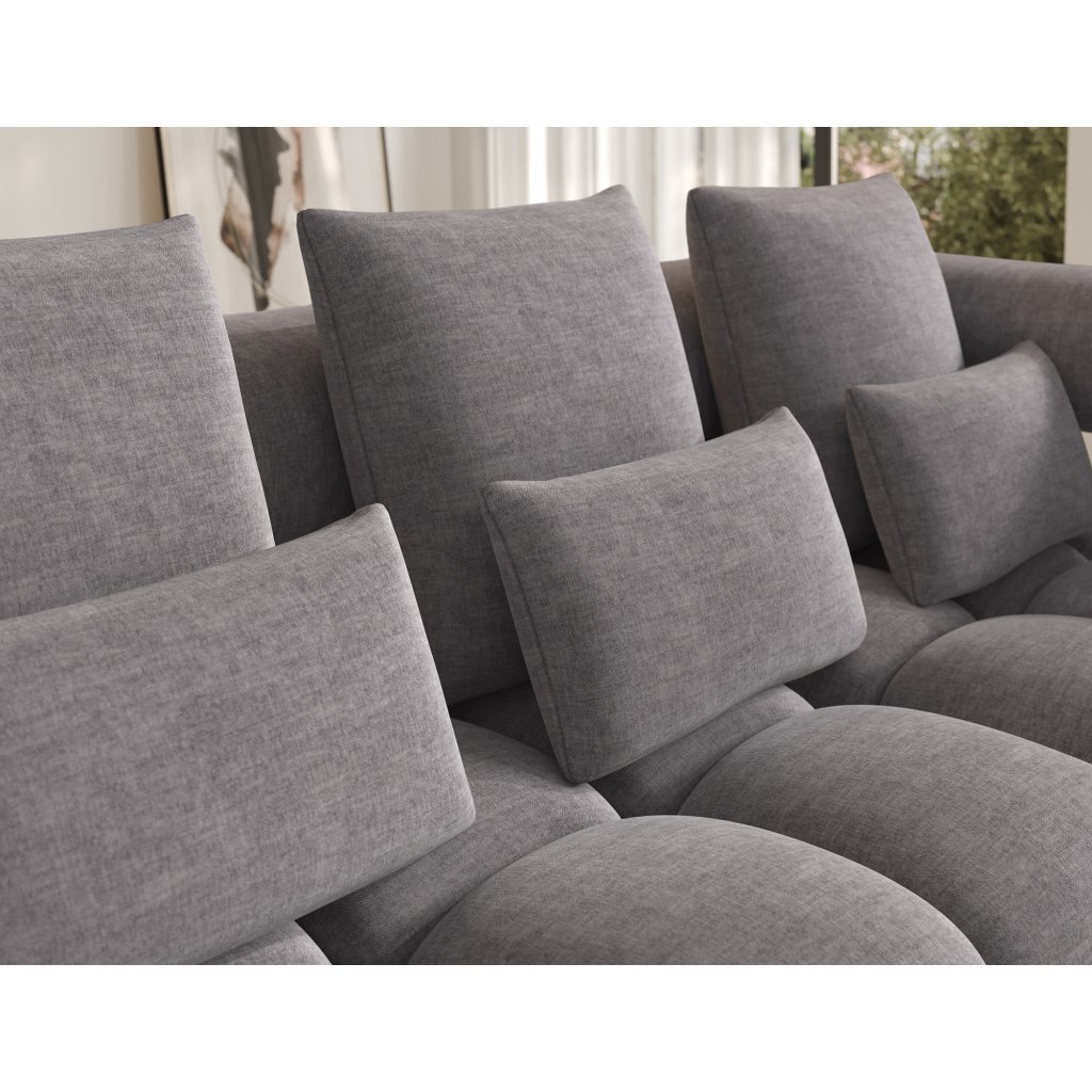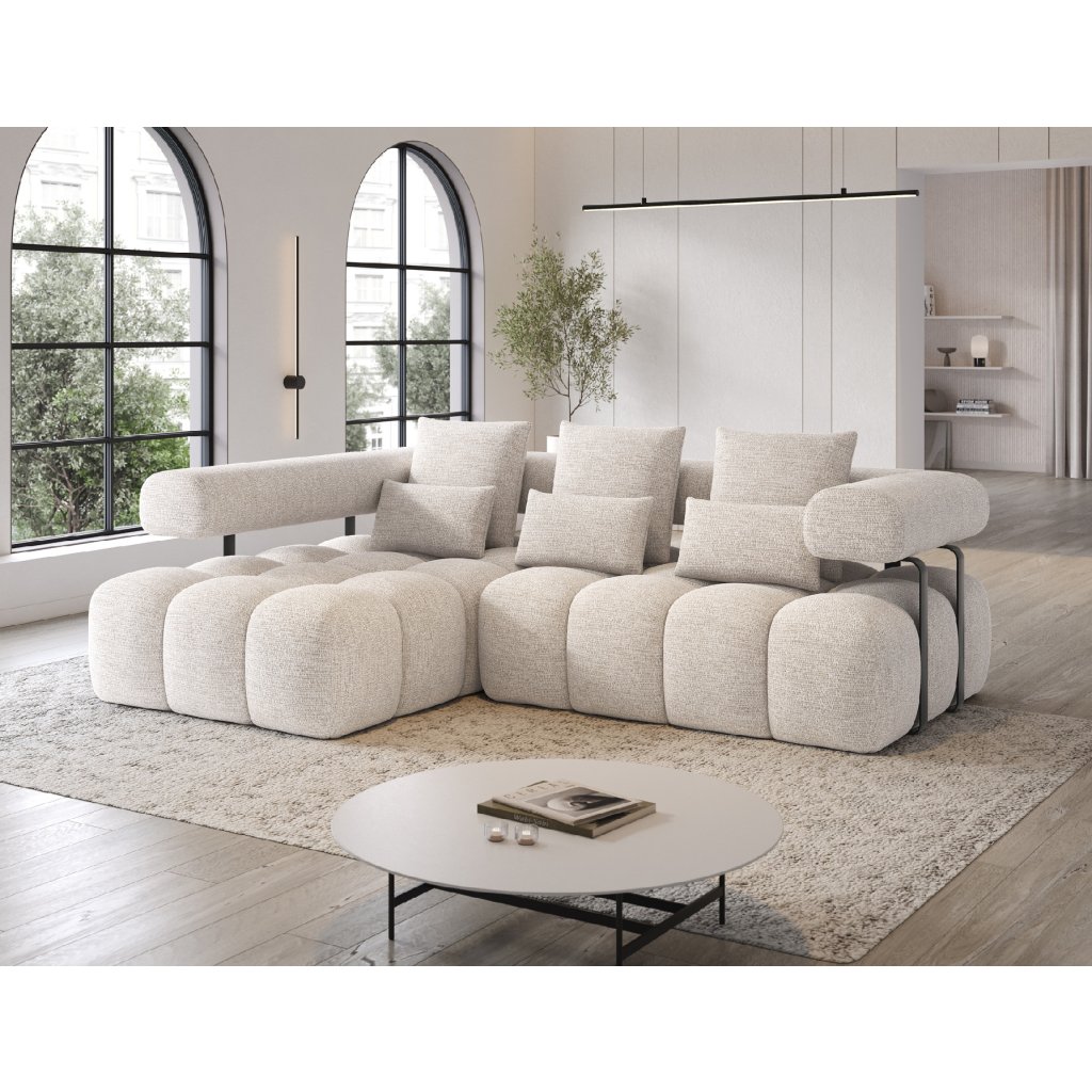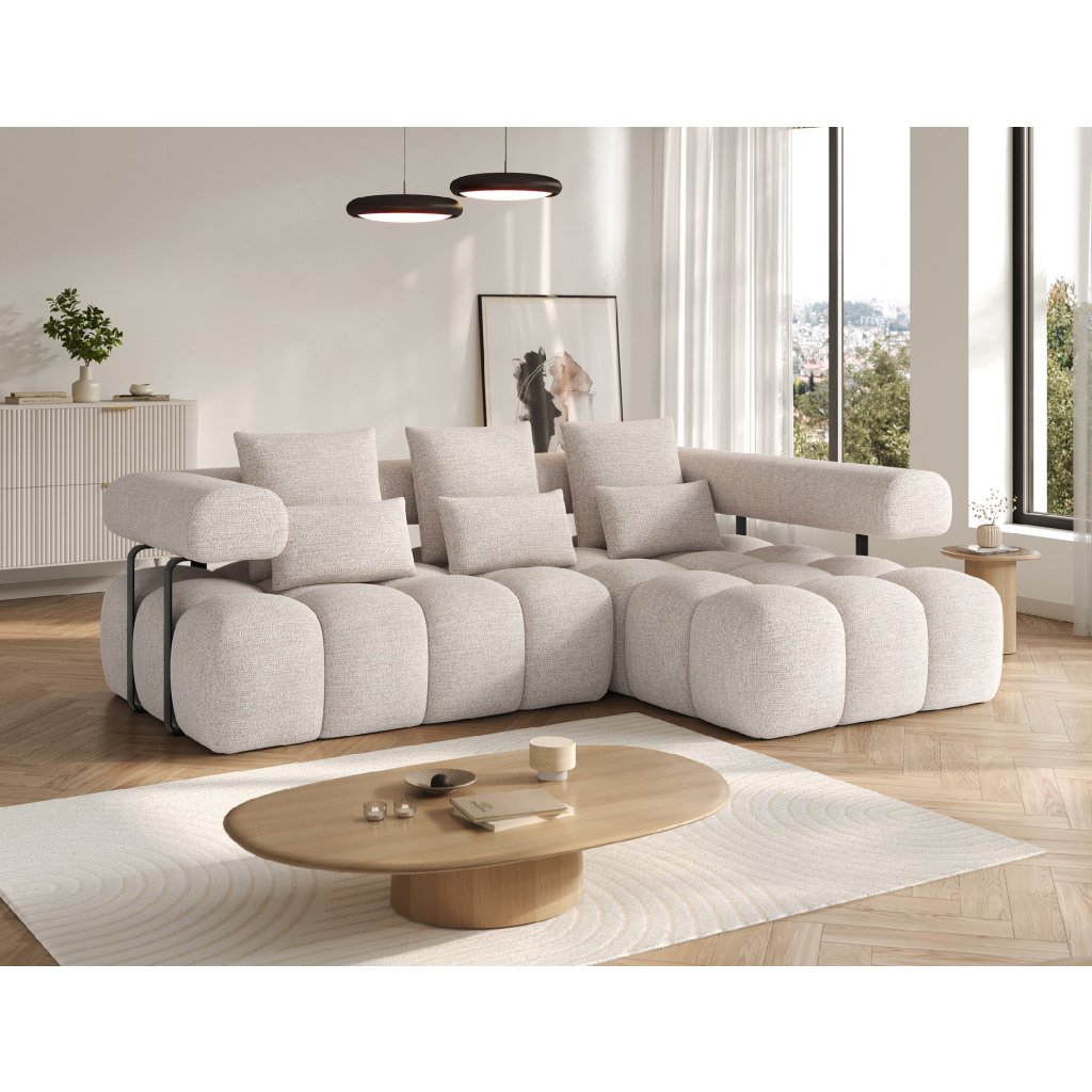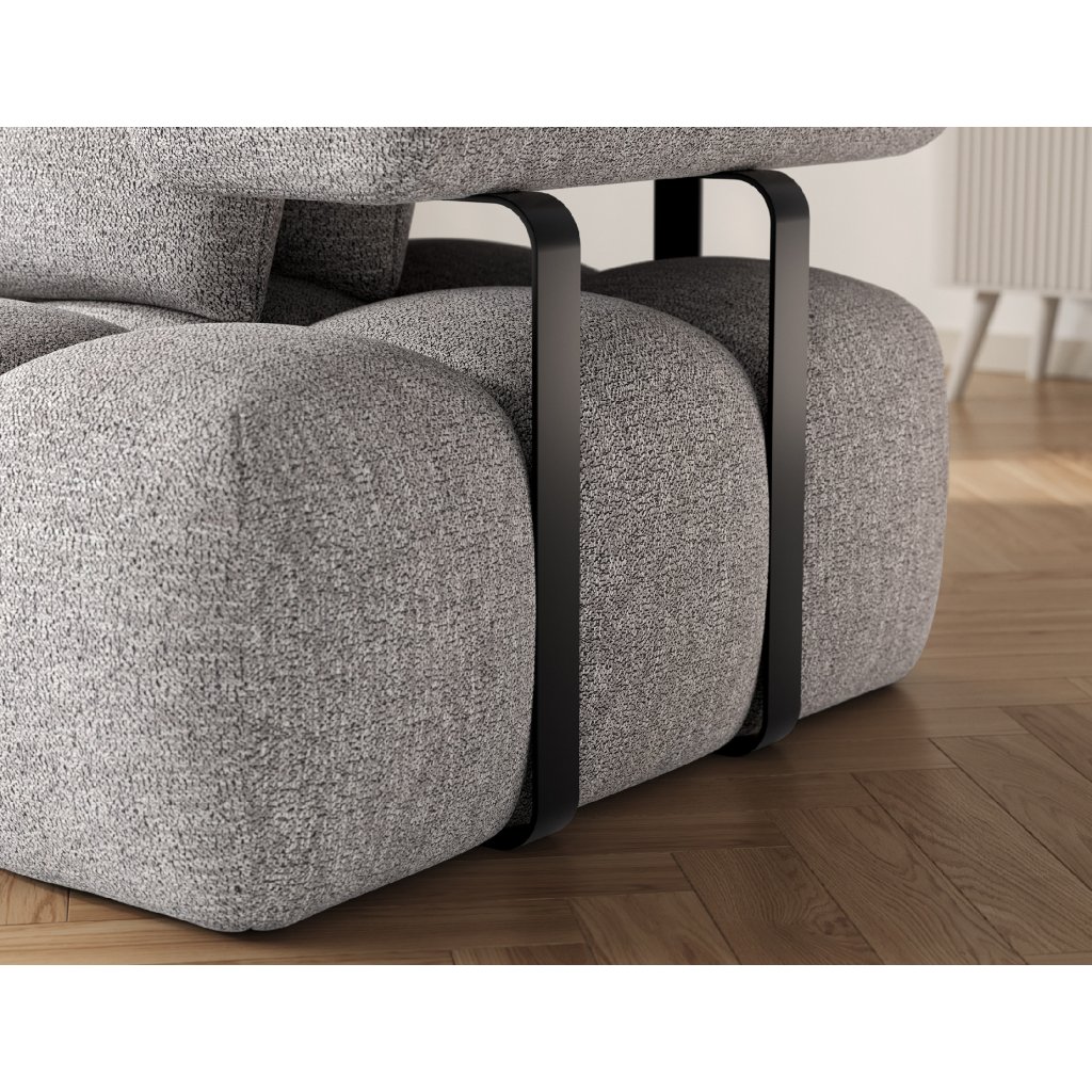 Sedací souprava je vybavena praktickou funkcí spaní, která umožňuje rychlou přeměnu na pohodlné lůžko. Tapecírovaný zadní díl umožňuje volné umístění v prostoru bez nutnosti přisunout ke stěně, což zvyšuje flexibilitu při aranžování místnosti. Černé plastové nohy doplňují celkový vzhled a podtrhují moderní, minimalistický charakter sedací soupravy Levvi, která je ideální volbou pro ty, kdo hledají elegantní, pohodlný a praktický nábytek do obývacího pokoje.