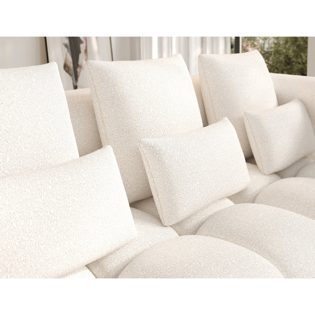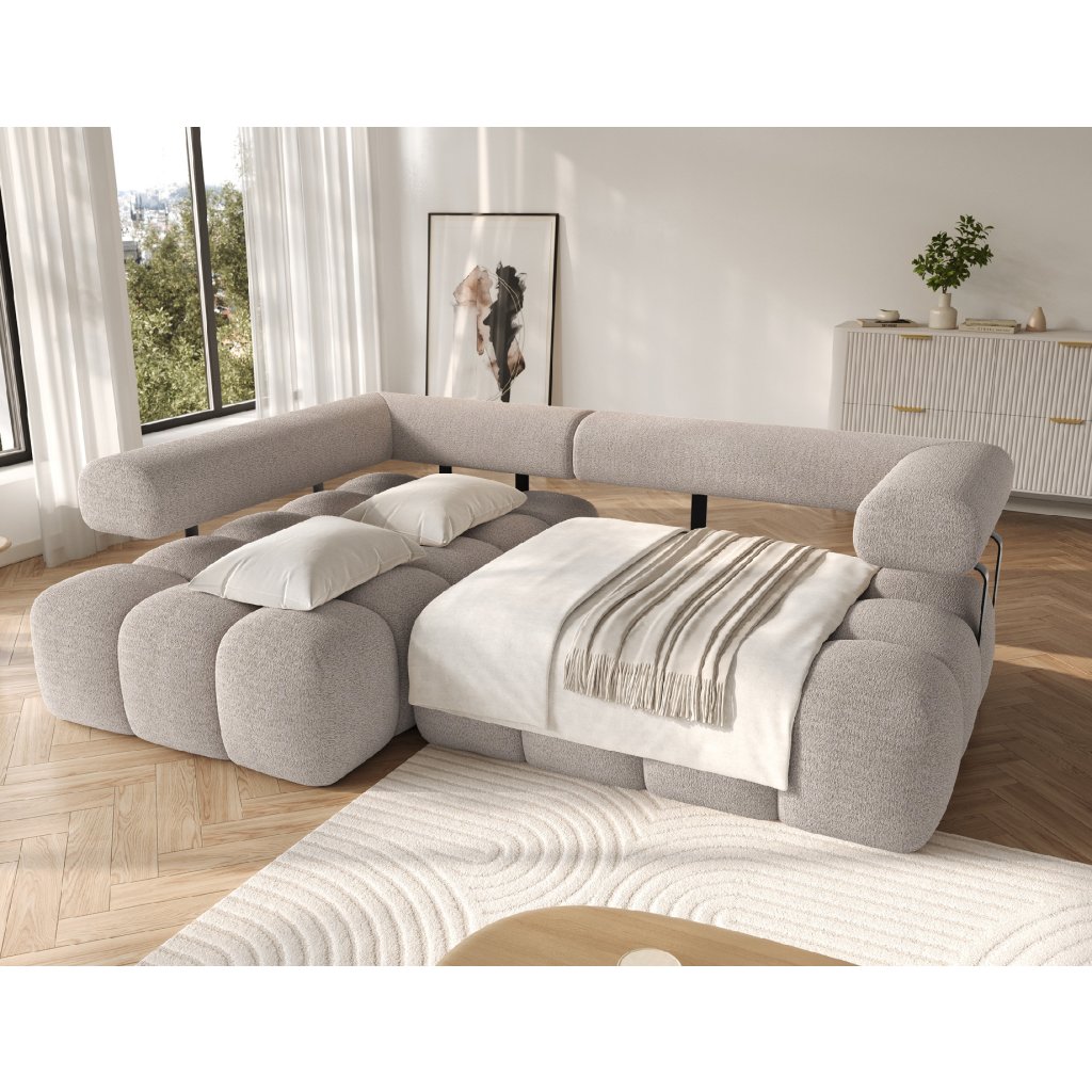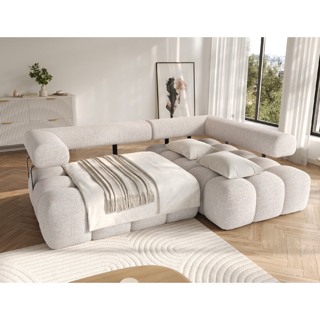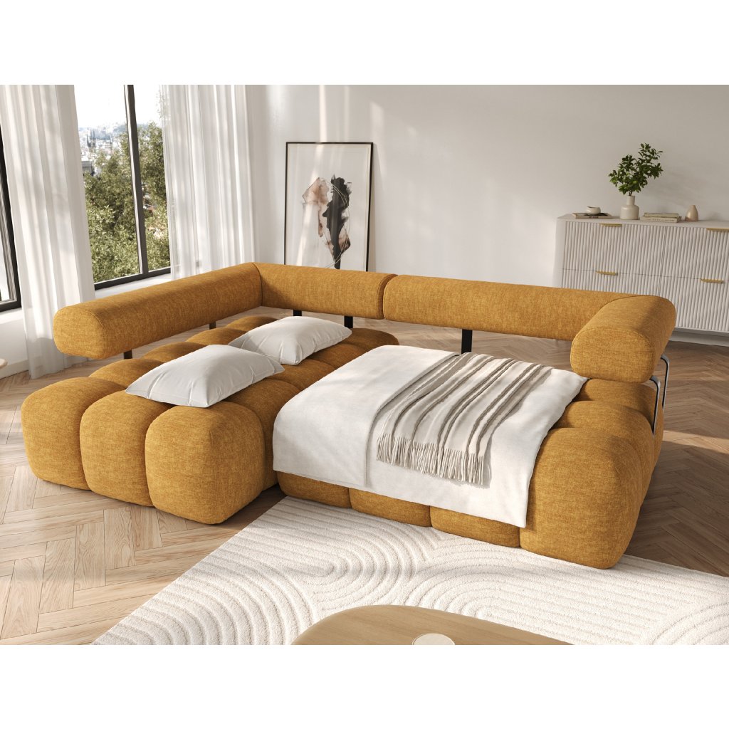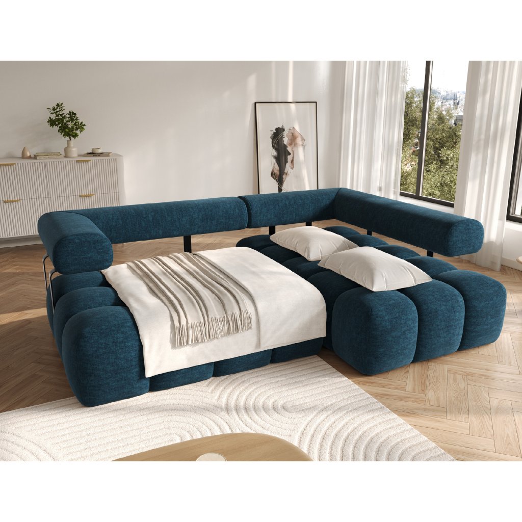 Sedací souprava je vybavena praktickou funkcí spaní, která umožňuje rychlou přeměnu na pohodlné lůžko. Tapecírovaný zadní díl umožňuje volné umístění v prostoru bez nutnosti přisunout ke stěně, což zvyšuje flexibilitu při aranžování místnosti. Černé plastové nohy doplňují celkový vzhled a podtrhují moderní, minimalistický charakter sedací soupravy Levvi, která je ideální volbou pro ty, kdo hledají elegantní, pohodlný a praktický nábytek do obývacího pokoje.
